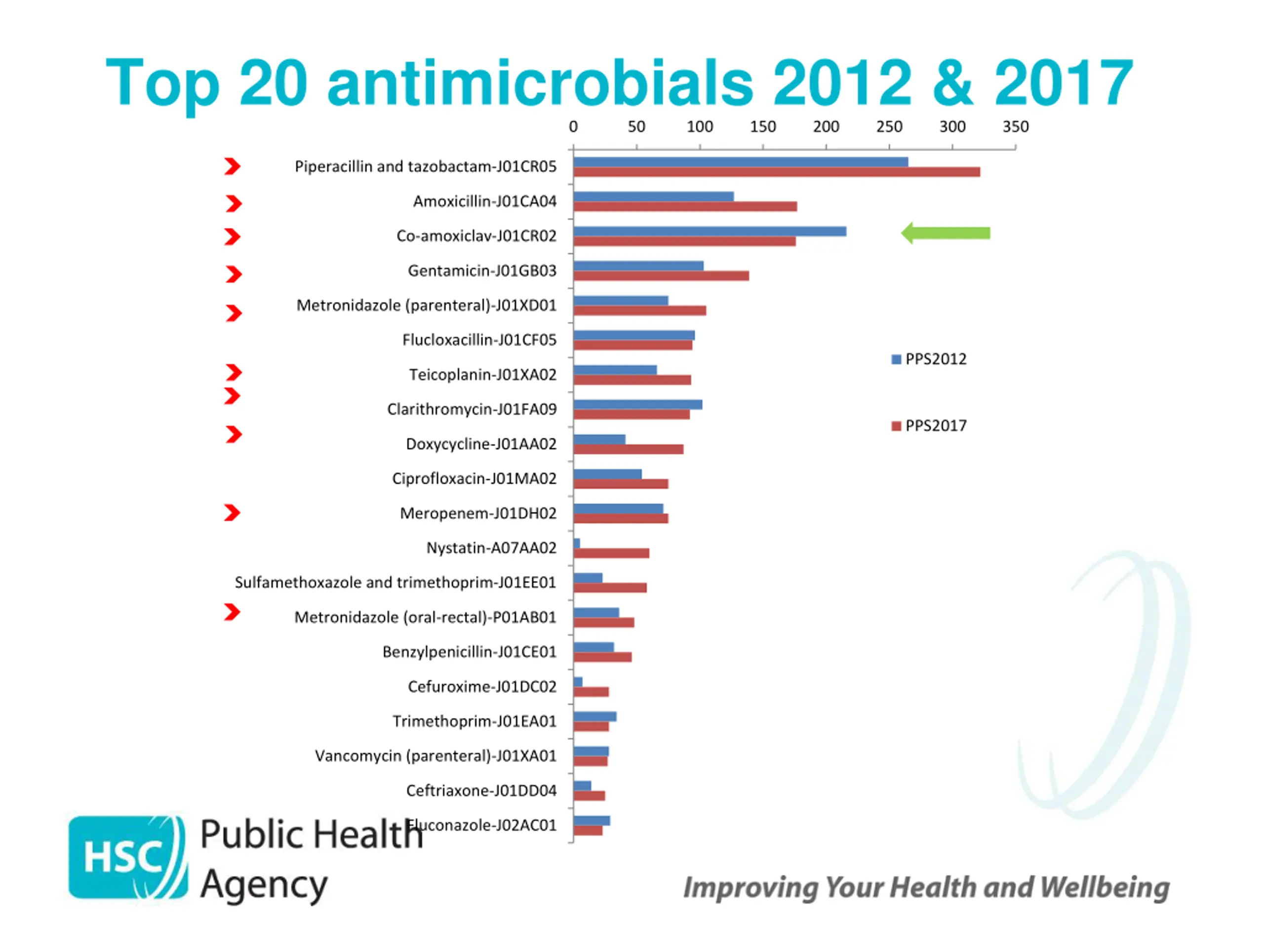 Top 20 antimicrobials 2012 & 2017 0 50 100 150 200 250 300 350 Piperacillin and tazobactam-J01CR05 Amoxicillin-J01CA04 Co-amoxiclav-J01CR02 Gentamicin-J01GB03 Metronidazole (parenteral)-J01XD01 Flucloxacillin-J01CF05 PPS2012 Teicoplanin-J01XA02 Clarithromycin-J01FA09 PPS2017 Doxycycline-J01AA02 Ciprofloxacin-J01MA02 Meropenem-J01DH02 Nystatin-A07AA02 Sulfamethoxazole and trimethoprim-J01EE01 Metronidazole (oral-rectal)-P01AB01 Benzylpenicillin-J01CE01 Cefuroxime-J01DC02 Trimethoprim-J01EA01 Vancomycin (parenteral)-J01XA01 Ceftriaxone-J01DD04 Fluconazole-J02AC01
