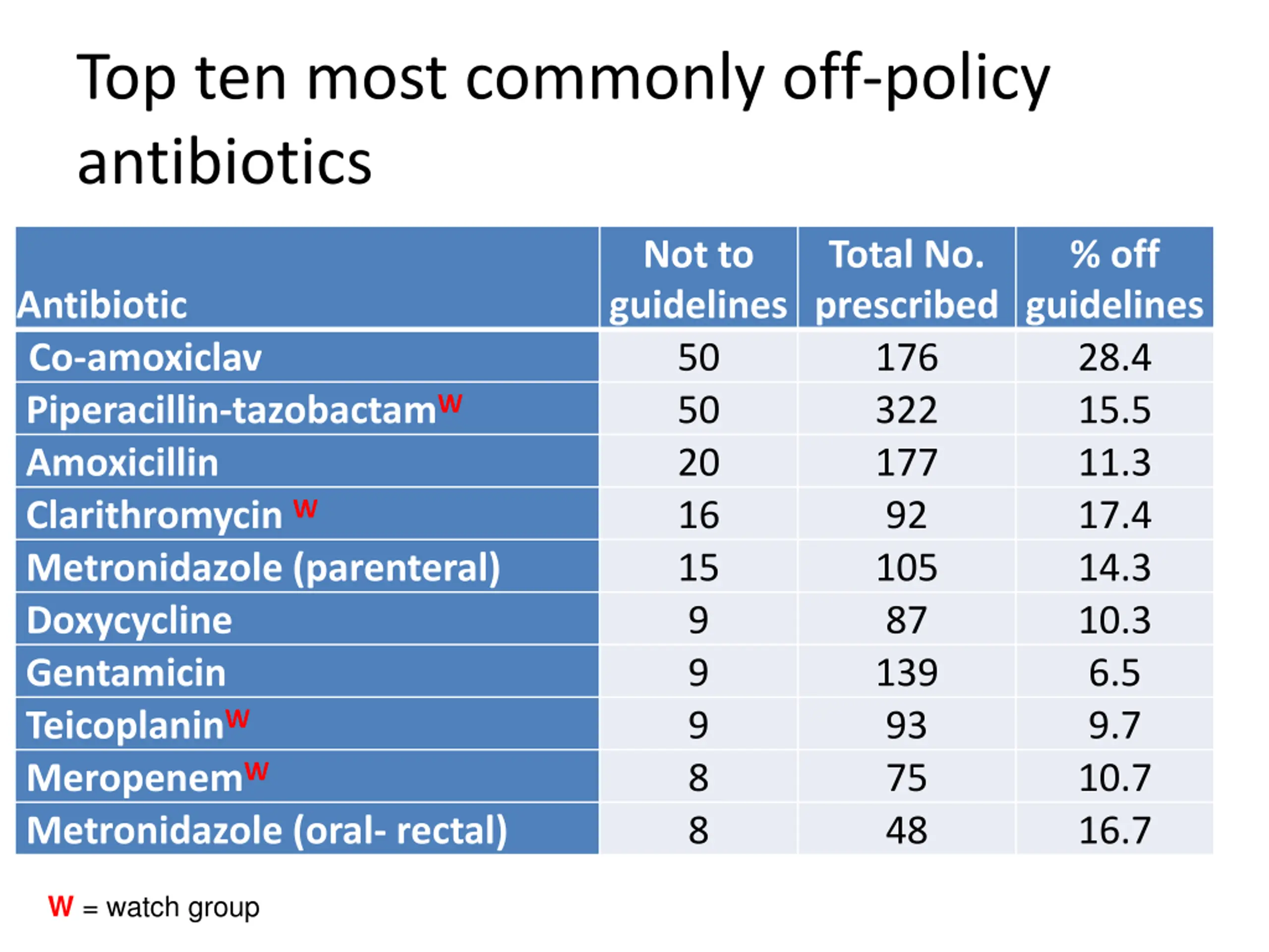 Top ten most commonly off-policy antibiotics Not to guidelines 50 50 20 16 15 9 9 9 8 8 Total No. prescribed 176 322 177 92 105 87 139 93 75 48 % off guidelines 28.4 15.5 11.3 17.4 14.3 10.3 6.5 9.7 10.7 16.7 Antibiotic Co-amoxiclav Piperacillin-tazobactamW Amoxicillin Clarithromycin W Metronidazole (parenteral) Doxycycline Gentamicin TeicoplaninW MeropenemW Metronidazole (oral- rectal) W = watch group