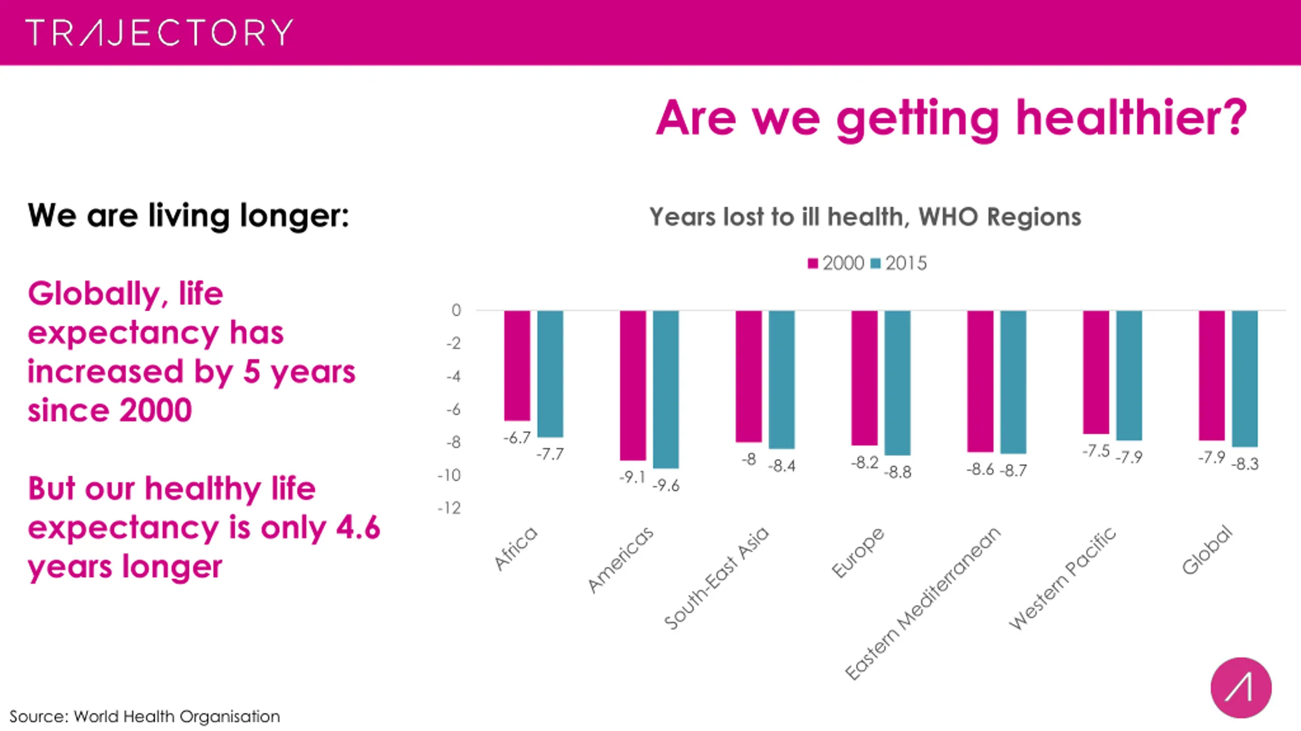 Are we getting healthier? We are living longer: Years lost to ill health, WHO Regions 2000 2015 Globally, life expectancy has increased by 5 years since 2000 0 -2 -4 -6 -6.7 -8 -7.5 -7.7 -7.9 -7.9 -8 -8.2 -8.3 -8.4 -8.6 -8.7 -8.8 -10 -9.1 But our healthy life expectancy is only 4.6 years longer -9.6 -12 Source: World Health Organisation