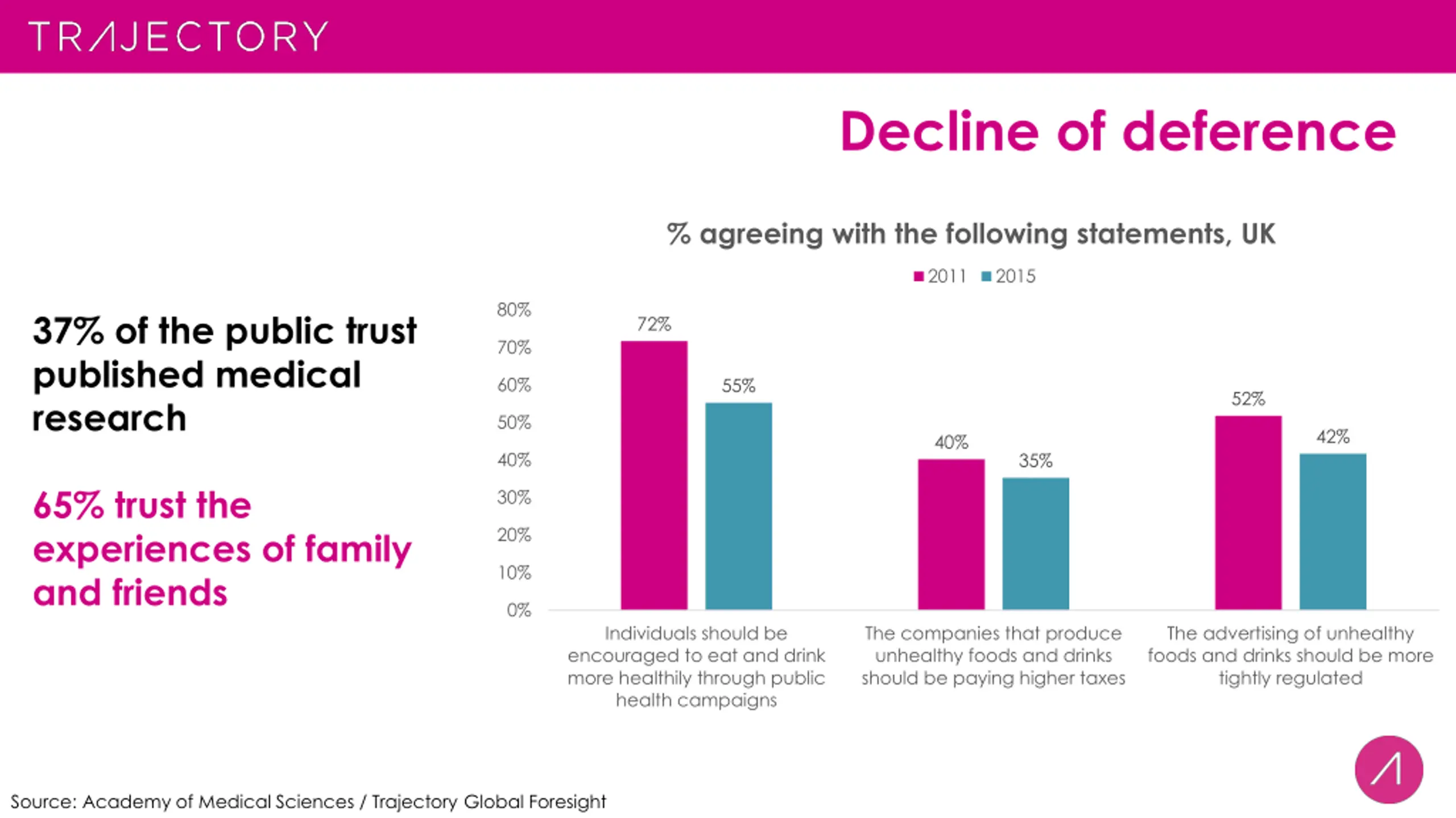 Decline of deference % agreeing with the following statements, UK 2011 2015 80% 37% of the public trust published medical research 72% 70% 60% 55% 52% 50% 42% 40% 40% 35% 65% trust the experiences of family and friends 30% 20% 10% 0% Individuals should be encouraged to eat and drink more healthily through public health campaigns The companies that produce unhealthy foods and drinks should be paying higher taxes The advertising of unhealthy foods and drinks should be more tightly regulated Source: Academy of Medical Sciences / Trajectory Global Foresight