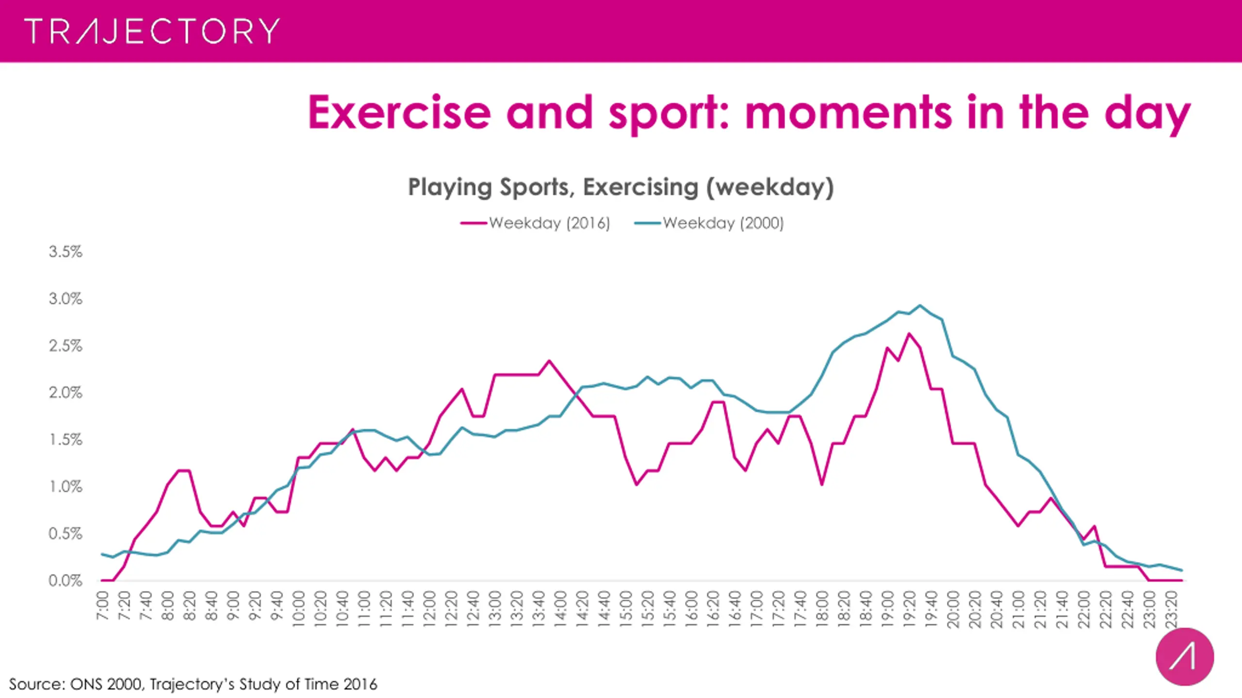 Exercise and sport: moments in the day Playing Sports, Exercising (weekday) Weekday (2016) Weekday (2000) 3.5% 3.0% 2.5% 2.0% 1.5% 1.0% 0.5% 0.0% 14:40 19:40 9:40 10:00 10:20 10:40 11:00 11:20 11:40 12:00 12:20 12:40 13:00 13:20 13:40 14:00 14:20 15:00 15:20 15:40 16:00 16:20 16:40 17:00 17:20 17:40 18:00 18:20 18:40 19:00 19:20 20:00 20:20 20:40 21:00 21:20 21:40 22:00 22:20 22:40 23:00 23:20 7:00 7:20 7:40 8:00 8:20 8:40 9:00 9:20 Source: ONS 2000, Trajectory s Study of Time 2016