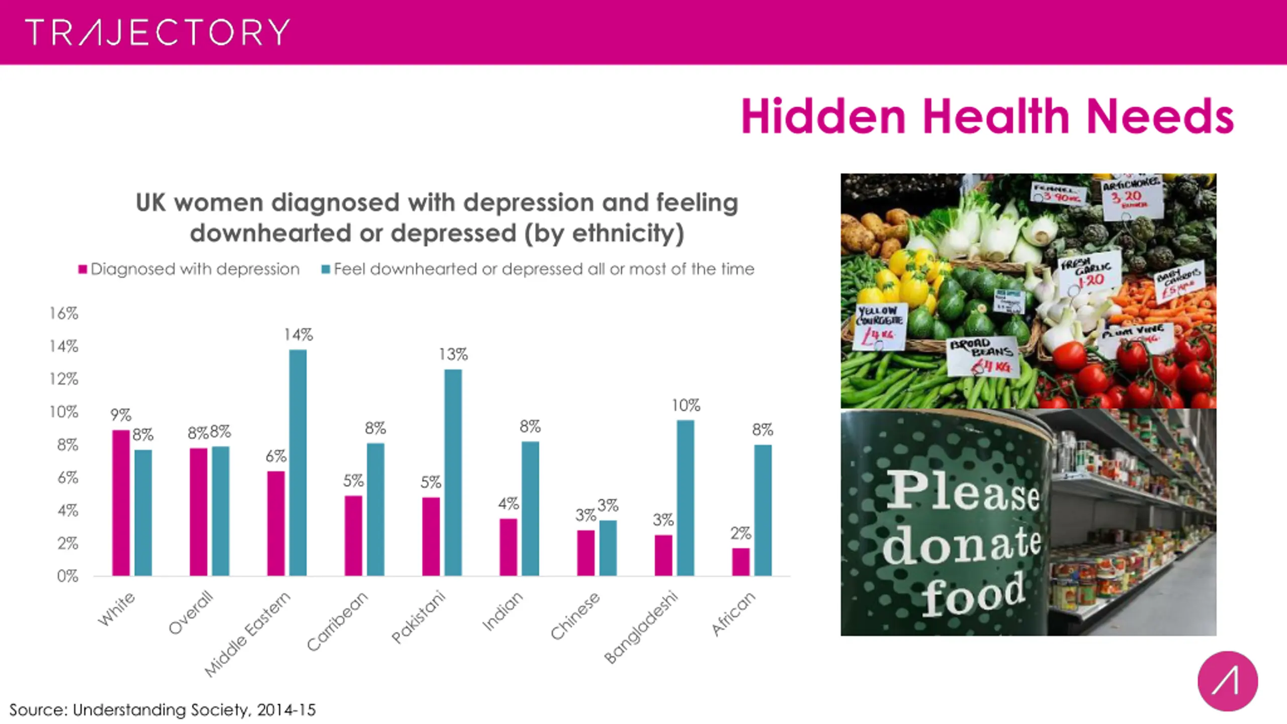 Hidden Health Needs UK women diagnosed with depression and feeling downhearted or depressed (by ethnicity) Diagnosed with depression Feel downhearted or depressed all or most of the time 16% 14% 14% 13% 12% 10% 10% 9% 8% 8% 8% 8% 8% 8% 8% 6% 6% 5% 5% 4% 3% 4% 3% 3% 2% 2% 0% Source: Understanding Society, 2014-15