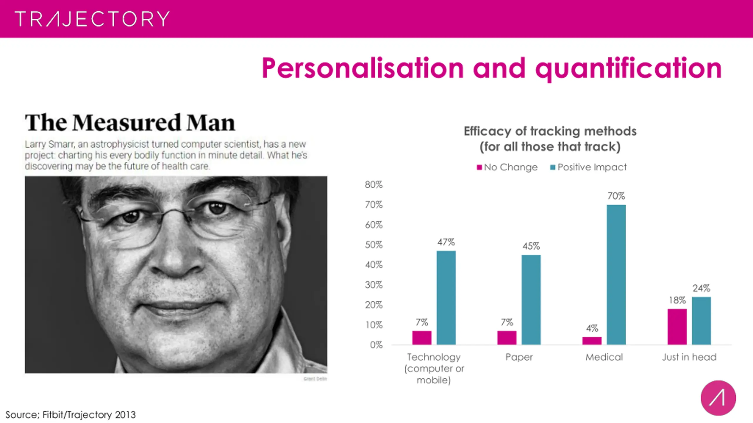 Personalisation and quantification Efficacy of tracking methods (for all those that track) No Change Positive Impact 80% 70% 70% 60% 47% 50% 45% 40% 30% 24% 18% 20% 7% 7% 10% 4% 0% Technology (computer or mobile) Paper Medical Just in head Source; Fitbit/Trajectory 2013