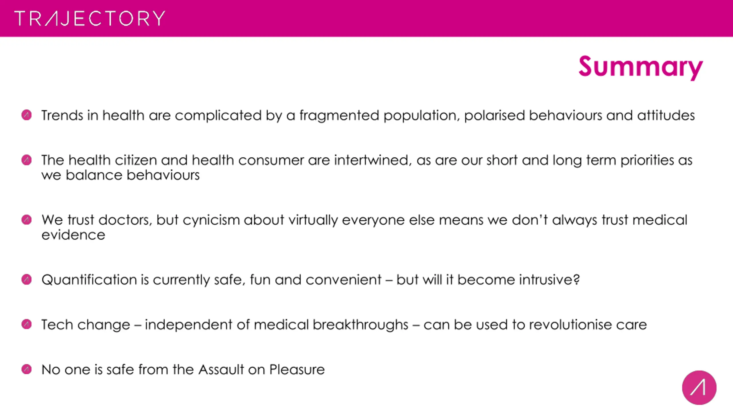 Summary Trends in health are complicated by a fragmented population, polarised behaviours and attitudes The health citizen and health consumer are intertwined, as are our short and long term priorities as we balance behaviours We trust doctors, but cynicism about virtually everyone else means we don t always trust medical evidence Quantification is currently safe, fun and convenient but will it become intrusive? Tech change independent of medical breakthroughs can be used to revolutionise care No one is safe from the Assault on Pleasure