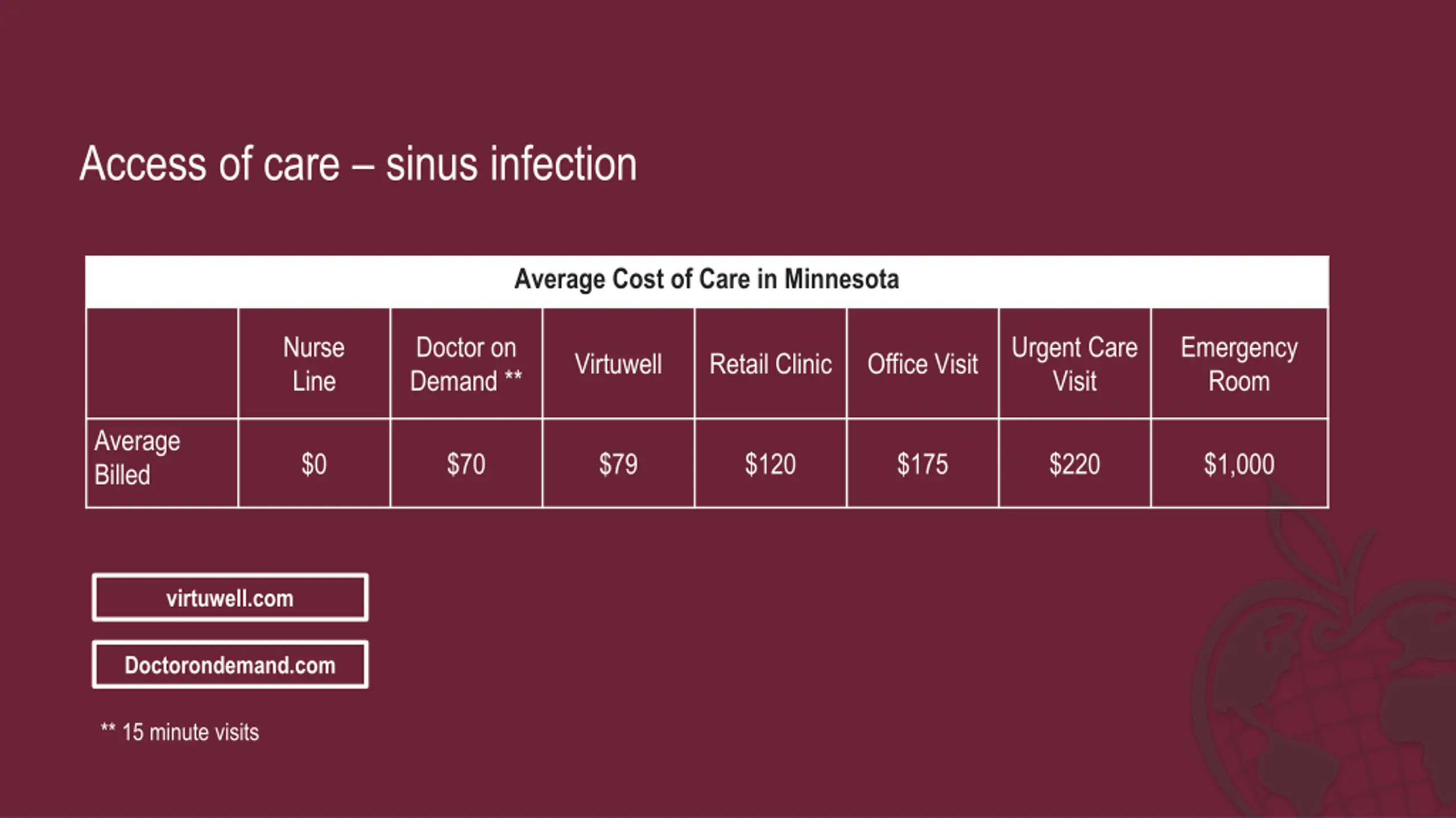 Access of care sinus infection Average Cost of Care in Minnesota Nurse Line Doctor on Demand ** Urgent Care Visit Emergency Room Virtuwell Retail Clinic Office Visit Average Billed $0 $70 $79 $120 $175 $220 $1,000 virtuwell.com Doctorondemand.com ** 15 minute visits