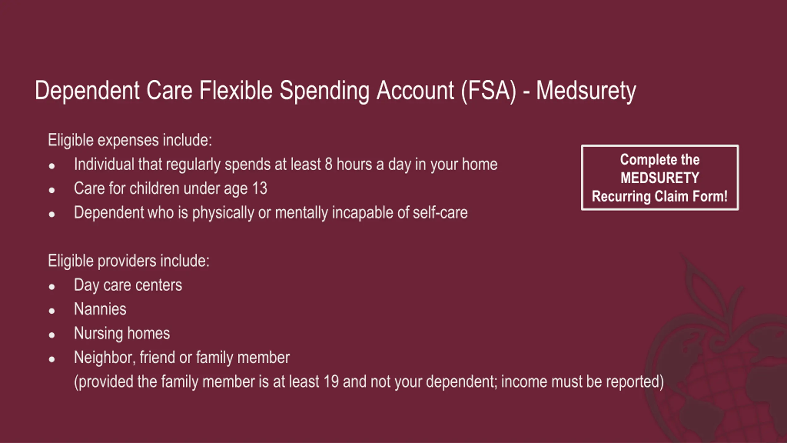 Dependent Care Flexible Spending Account (FSA) - Medsurety Eligible expenses include: Individual that regularly spends at least 8 hours a day in your home Care for children under age 13 Dependent who is physically or mentally incapable of self-care Complete the MEDSURETY Recurring Claim Form! Eligible providers include: Day care centers Nannies Nursing homes Neighbor, friend or family member (provided the family member is at least 19 and not your dependent; income must be reported)