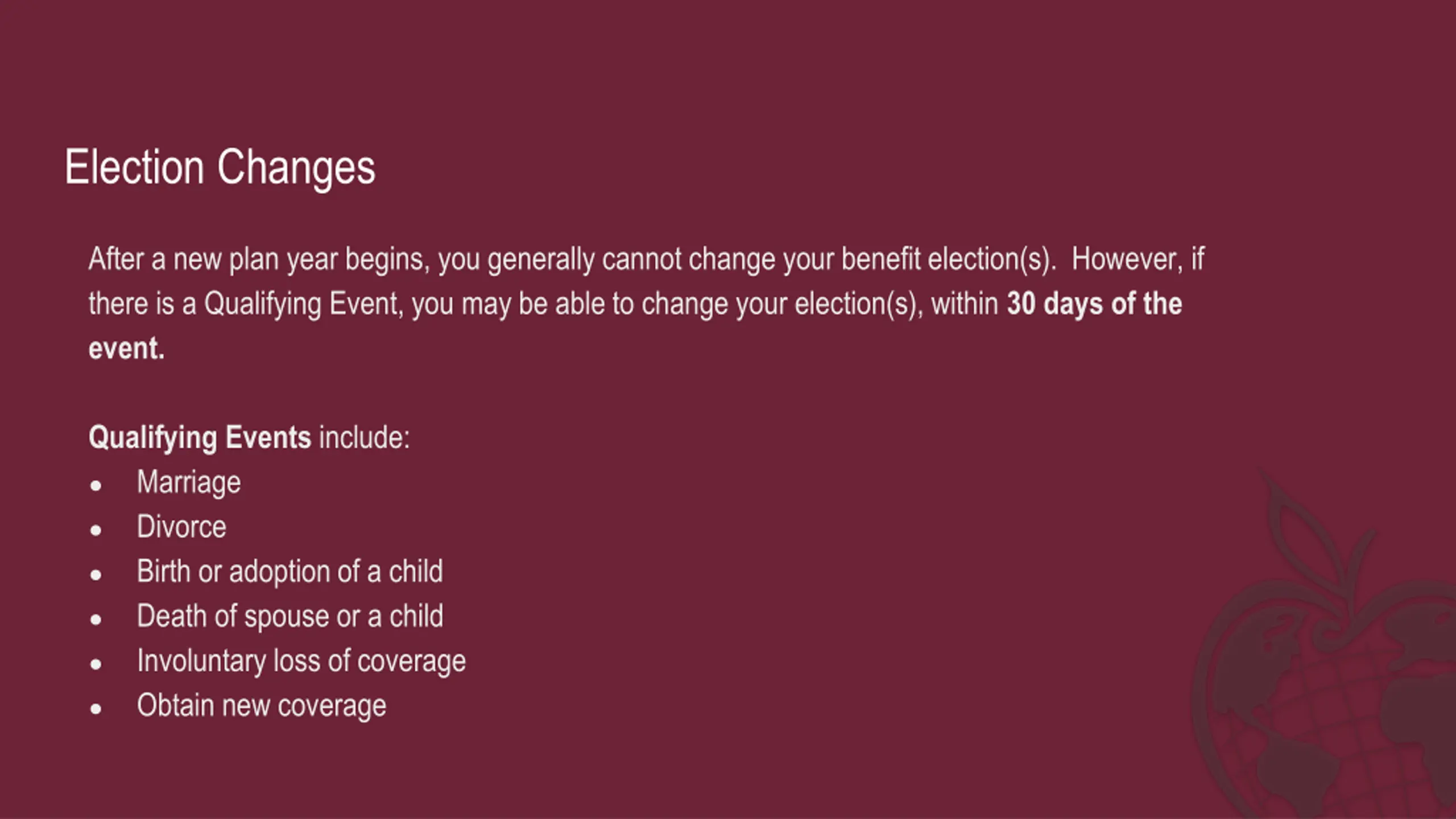 Election Changes After a new plan year begins, you generally cannot change your benefit election(s). However, if there is a Qualifying Event, you may be able to change your election(s), within 30 days of the event. Qualifying Events include: Marriage Divorce Birth or adoption of a child Death of spouse or a child Involuntary loss of coverage Obtain new coverage