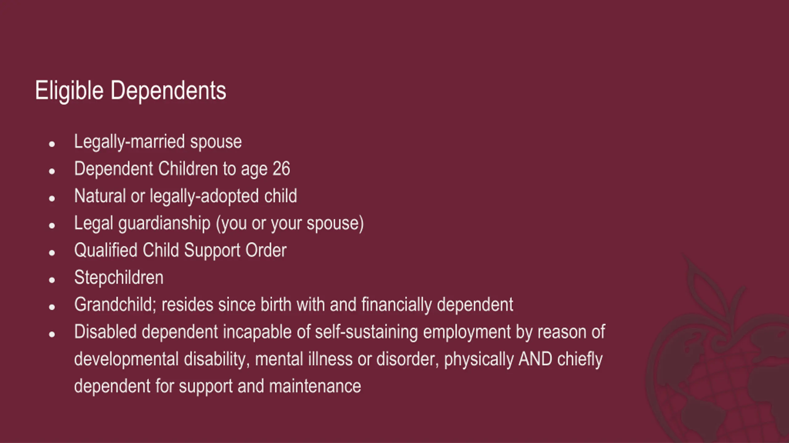 Eligible Dependents Legally-married spouse Dependent Children to age 26 Natural or legally-adopted child Legal guardianship (you or your spouse) Qualified Child Support Order Stepchildren Grandchild; resides since birth with and financially dependent Disabled dependent incapable of self-sustaining employment by reason of developmental disability, mental illness or disorder, physically AND chiefly dependent for support and maintenance