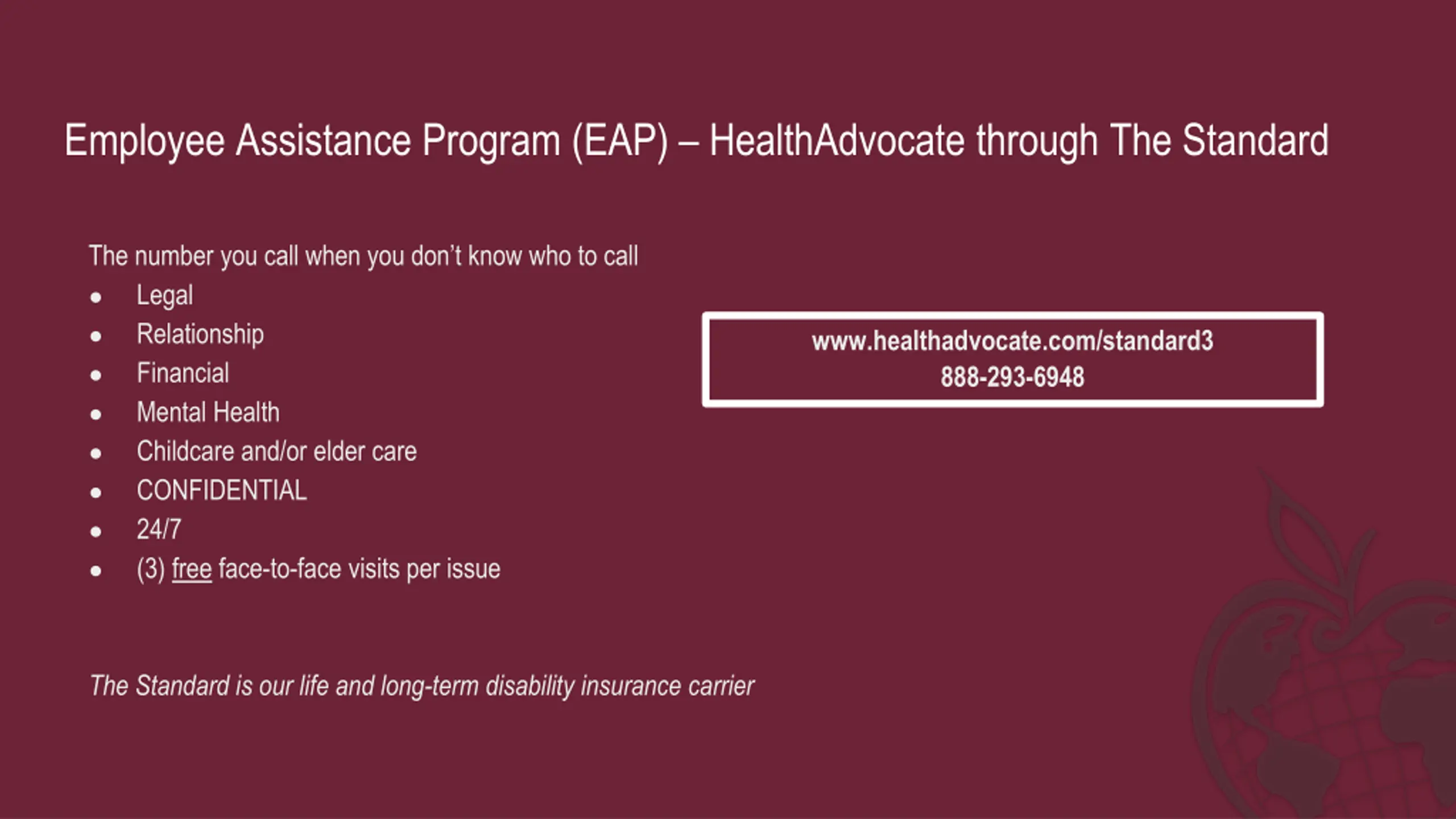 Employee Assistance Program (EAP) HealthAdvocate through The Standard The number you call when you don t know who to call Legal Relationship Financial Mental Health Childcare and/or elder care CONFIDENTIAL 24/7 (3) free face-to-face visits per issue www.healthadvocate.com/standard3 888-293-6948 The Standard is our life and long-term disability insurance carrier