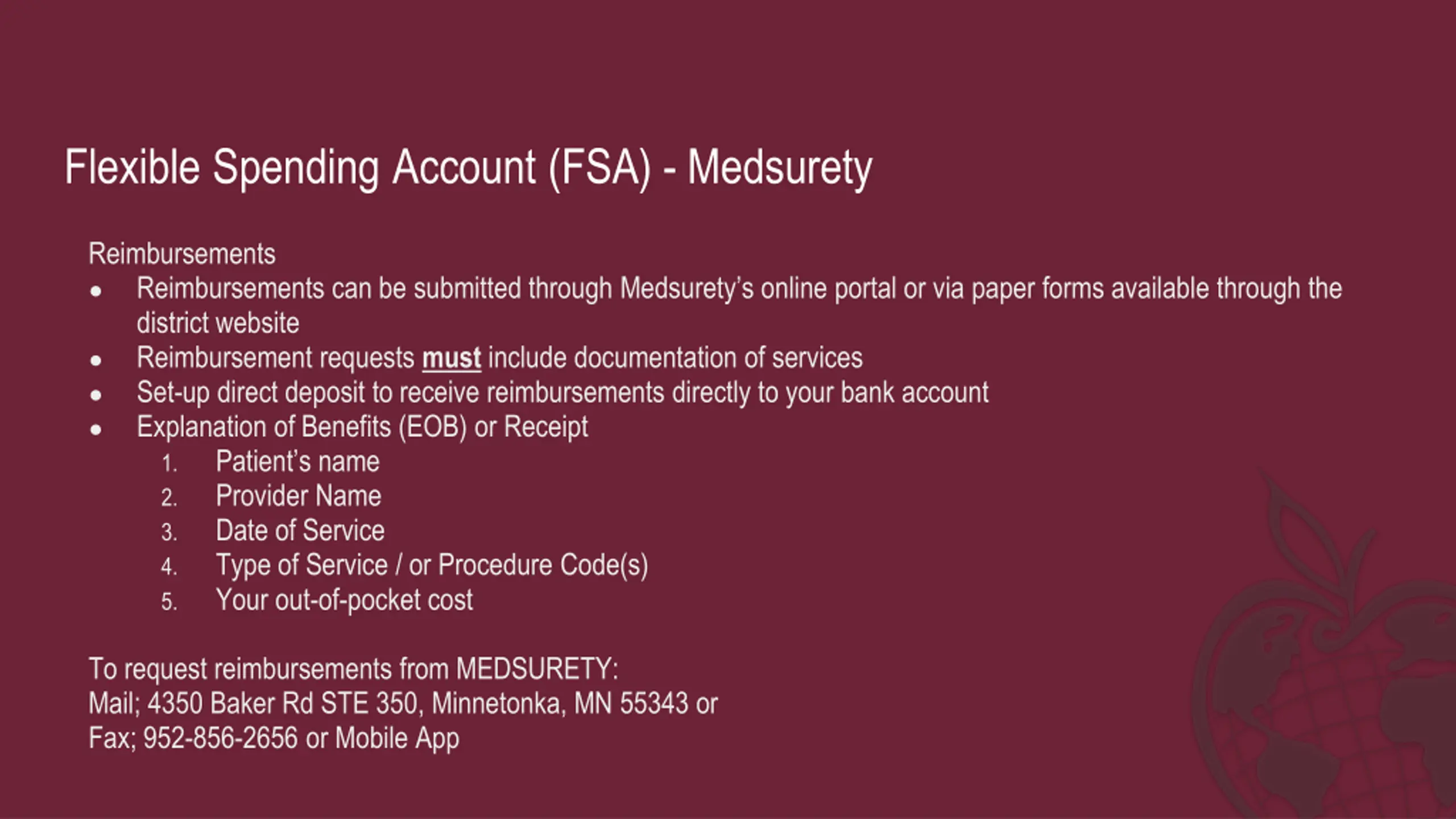 Flexible Spending Account (FSA) - Medsurety Reimbursements Reimbursements can be submitted through Medsurety s online portal or via paper forms available through the district website Reimbursement requests must include documentation of services Set-up direct deposit to receive reimbursements directly to your bank account Explanation of Benefits (EOB) or Receipt 1. Patient s name 2. Provider Name 3. Date of Service 4. Type of Service / or Procedure Code(s) 5. Your out-of-pocket cost To request reimbursements from MEDSURETY: Mail; 4350 Baker Rd STE 350, Minnetonka, MN 55343 or Fax; 952-856-2656 or Mobile App