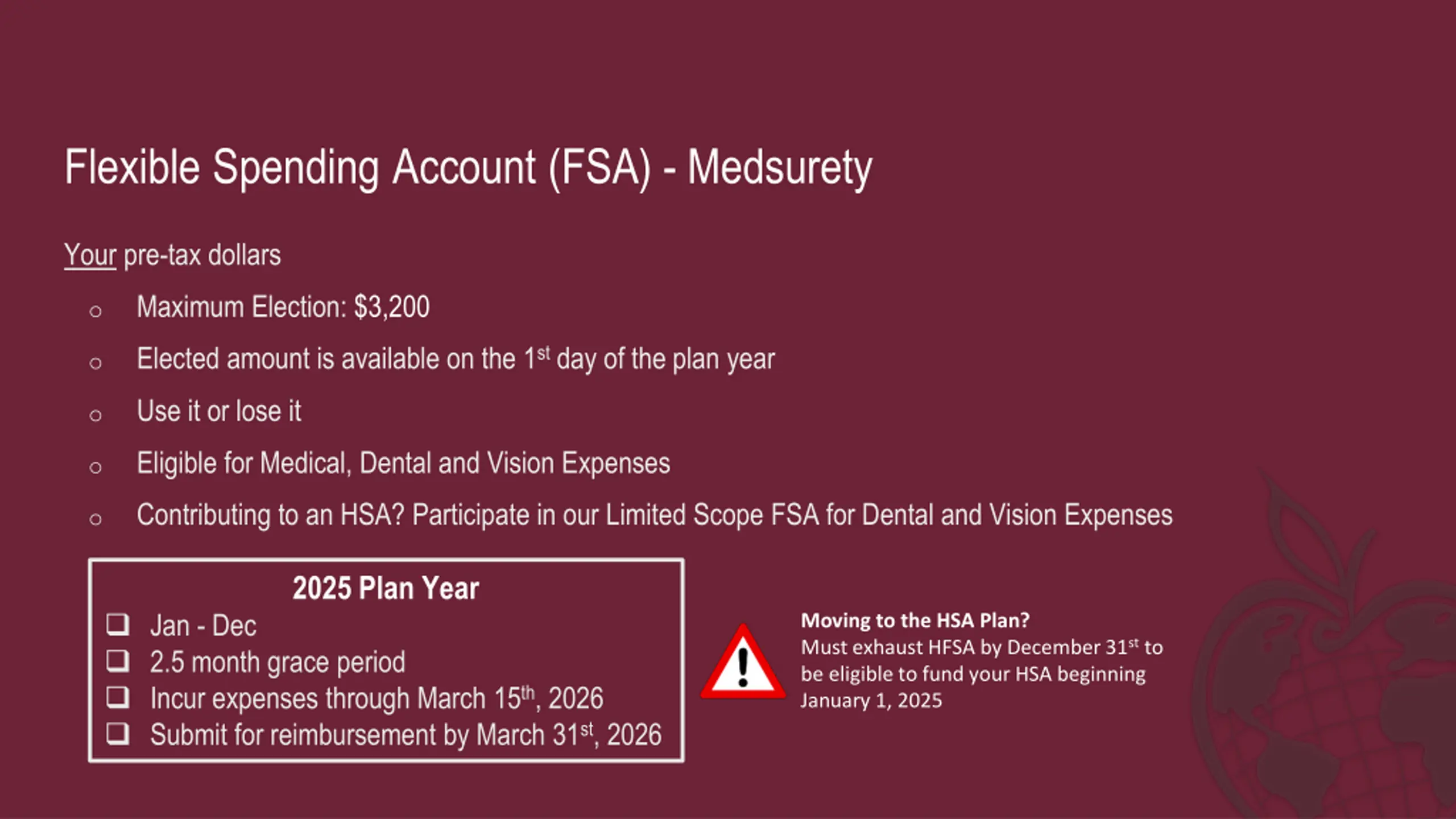 Flexible Spending Account (FSA) - Medsurety Your pre-tax dollars Maximum Election: $3,200 o Elected amount is available on the 1stday of the plan year o Use it or lose it o Eligible for Medical, Dental and Vision Expenses o Contributing to an HSA? Participate in our Limited Scope FSA for Dental and Vision Expenses o 2025 Plan Year Jan - Dec 2.5 month grace period Incur expenses through March 15th, 2026 Submit for reimbursement by March 31st, 2026 Moving to the HSA Plan? Must exhaust HFSA by December 31stto be eligible to fund your HSA beginning January 1, 2025