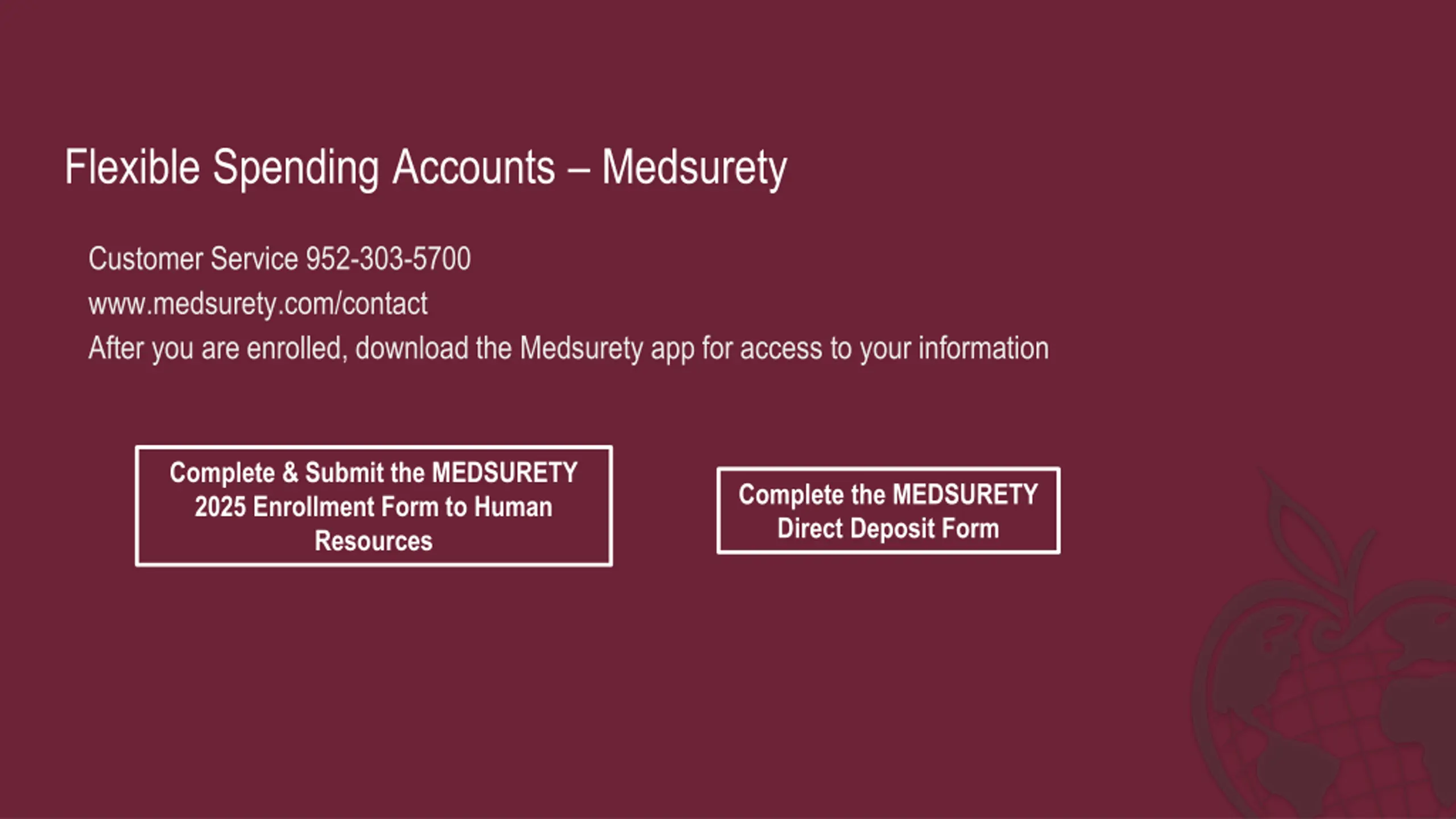 Flexible Spending Accounts Medsurety Customer Service 952-303-5700 www.medsurety.com/contact After you are enrolled, download the Medsurety app for access to your information Complete & Submit the MEDSURETY 2025 Enrollment Form to Human Resources Complete the MEDSURETY Direct Deposit Form