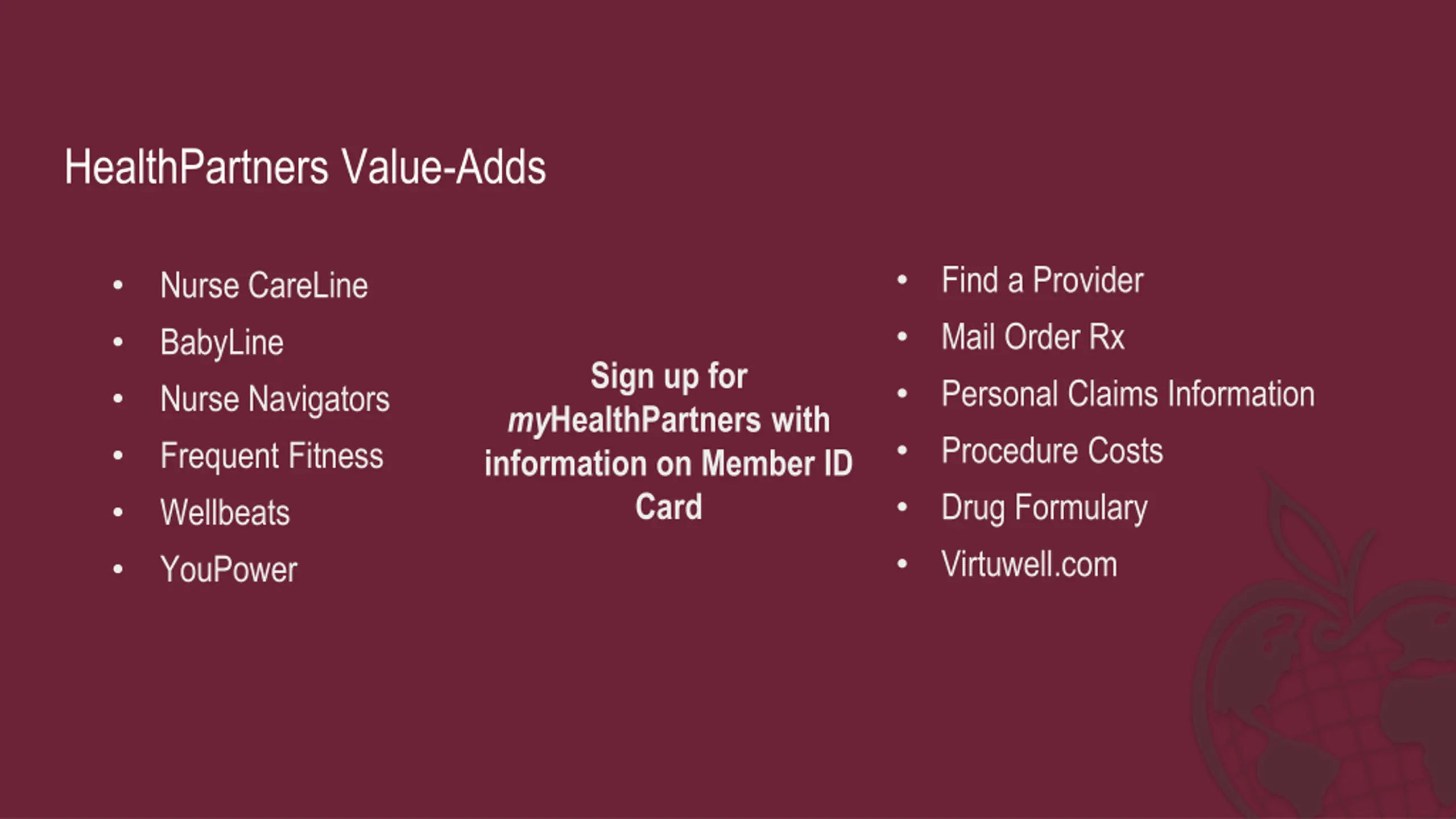 HealthPartners Value-Adds Find a Provider Mail Order Rx Personal Claims Information Procedure Costs Drug Formulary Virtuwell.com Nurse CareLine BabyLine Nurse Navigators Frequent Fitness Wellbeats YouPower Sign up for myHealthPartners with information on Member ID Card
