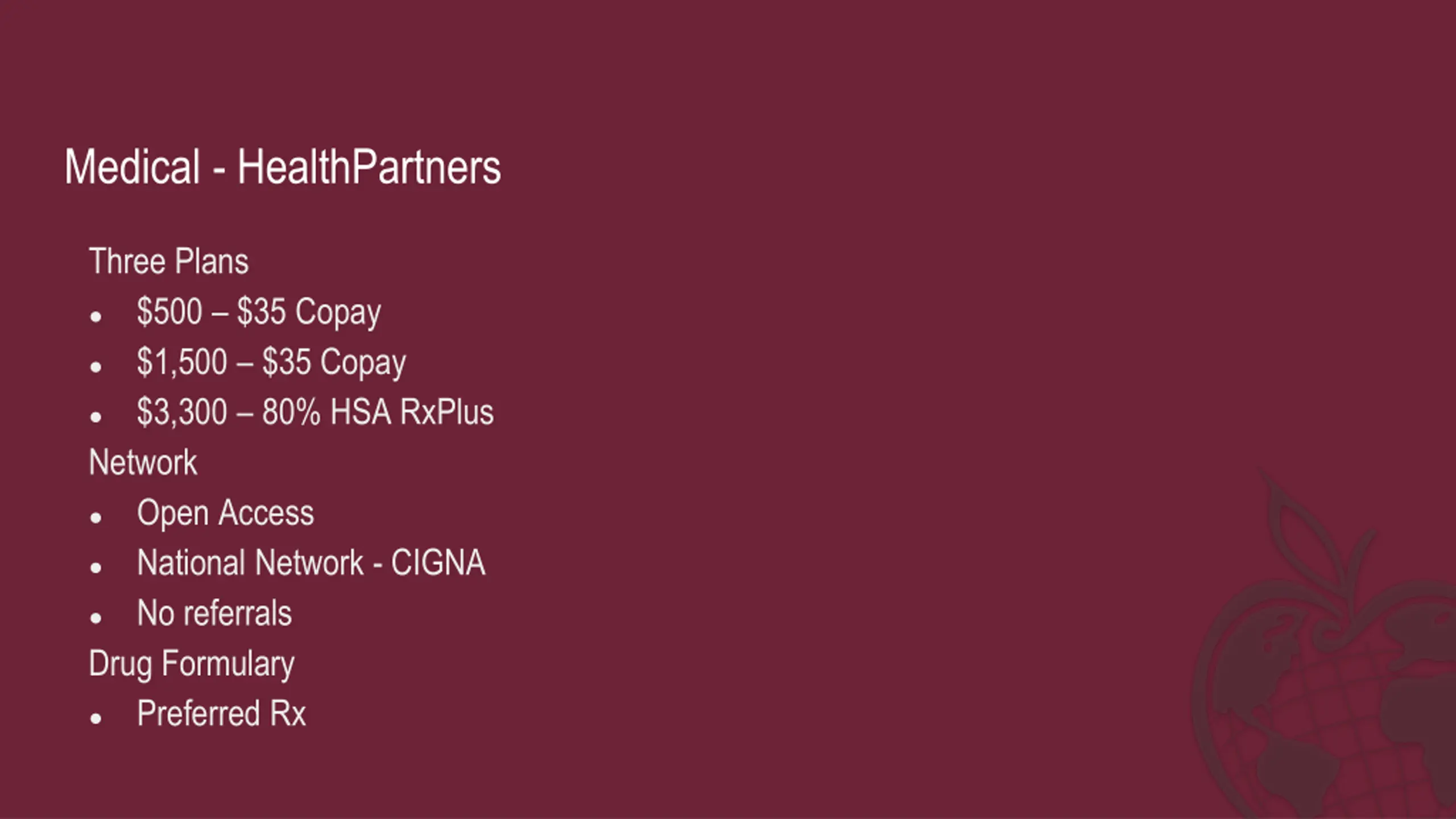 Medical - HealthPartners Three Plans $500 $35 Copay $1,500 $35 Copay $3,300 80% HSA RxPlus Network Open Access National Network - CIGNA No referrals Drug Formulary Preferred Rx