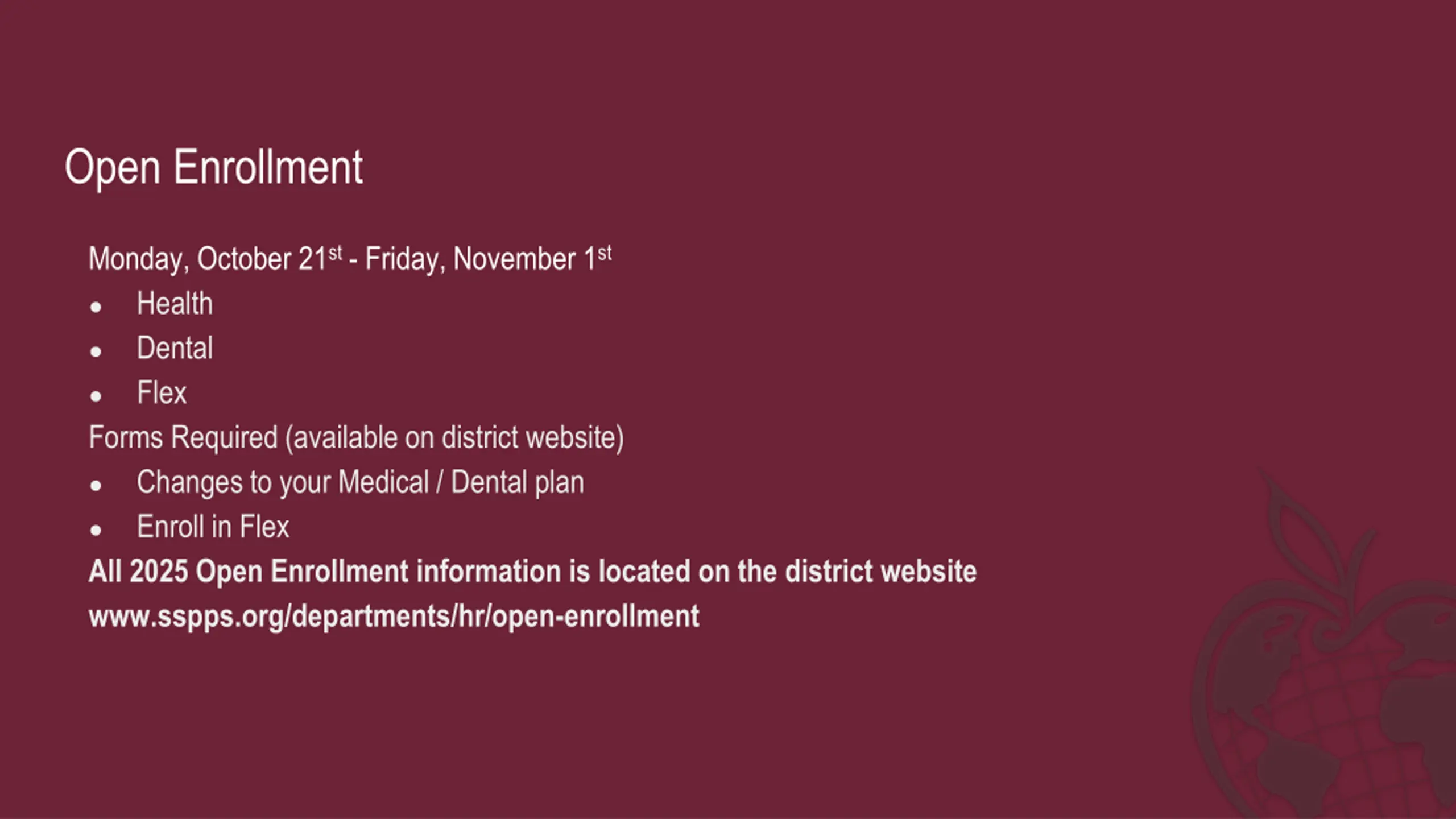 Open Enrollment Monday, October 21st- Friday, November 1st Health Dental Flex Forms Required (available on district website) Changes to your Medical / Dental plan Enroll in Flex All 2025 Open Enrollment information is located on the district website www.sspps.org/departments/hr/open-enrollment