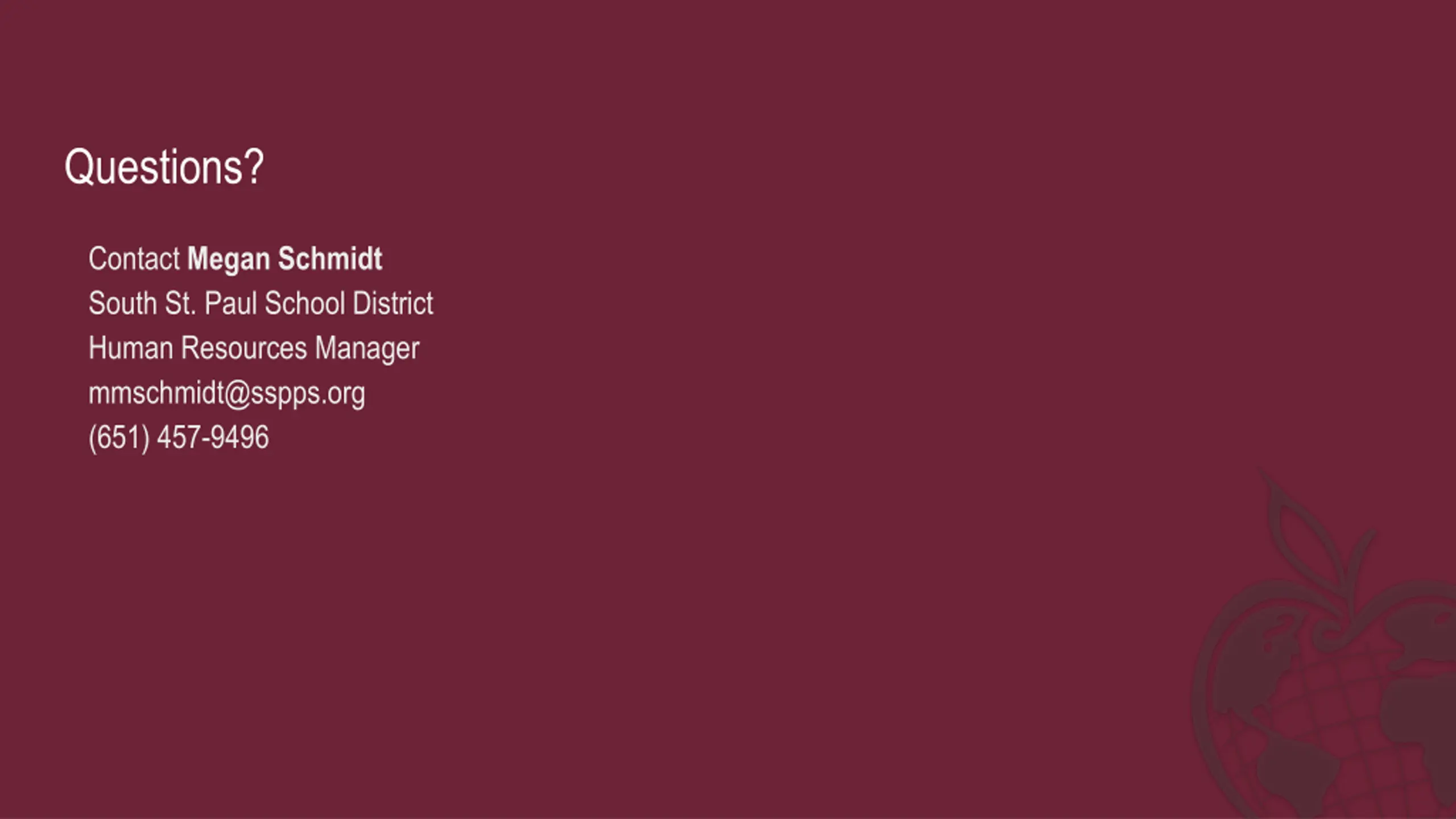 Questions? Contact Megan Schmidt South St. Paul School District Human Resources Manager mmschmidt@sspps.org (651) 457-9496