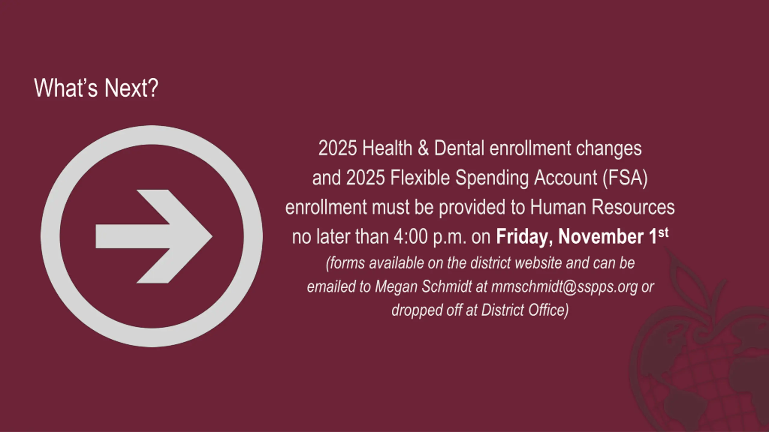 Whats Next? Image result for next 2025 Health & Dental enrollment changes and 2025 Flexible Spending Account (FSA) enrollment must be provided to Human Resources no later than 4:00 p.m. on Friday, November 1st (forms available on the district website and can be emailed to Megan Schmidt at mmschmidt@sspps.org or dropped off at District Office)