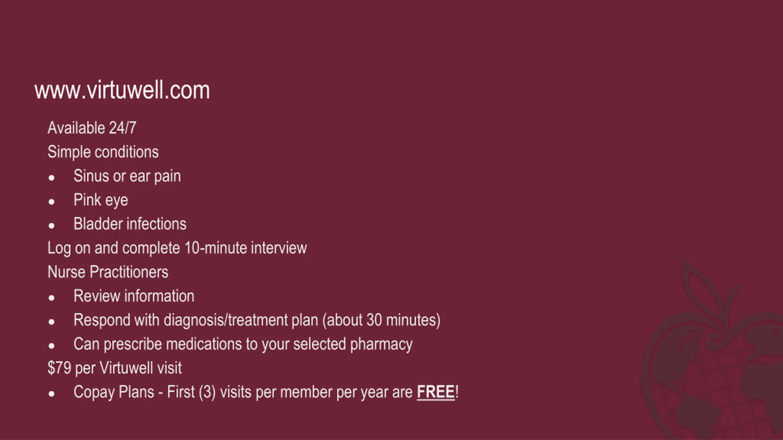 www.virtuwell.com Available 24/7 Simple conditions Sinus or ear pain Pink eye Bladder infections Log on and complete 10-minute interview Nurse Practitioners Review information Respond with diagnosis/treatment plan (about 30 minutes) Can prescribe medications to your selected pharmacy $79 per Virtuwell visit Copay Plans - First (3) visits per member per year are FREE!
