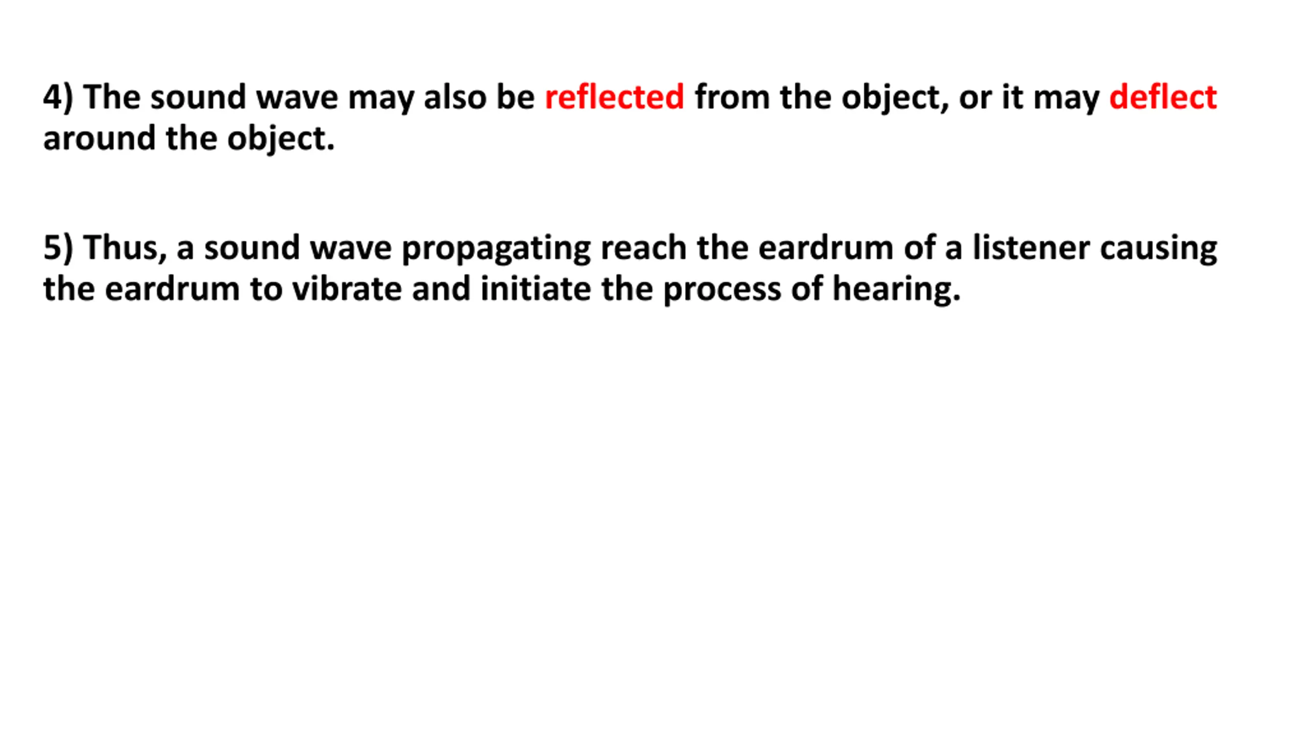 4) The sound wave may also be reflected from the object, or it may deflect around the object. 5) Thus, a sound wave propagating reach the eardrum of a listener causing the eardrum to vibrate and initiate the process of hearing.