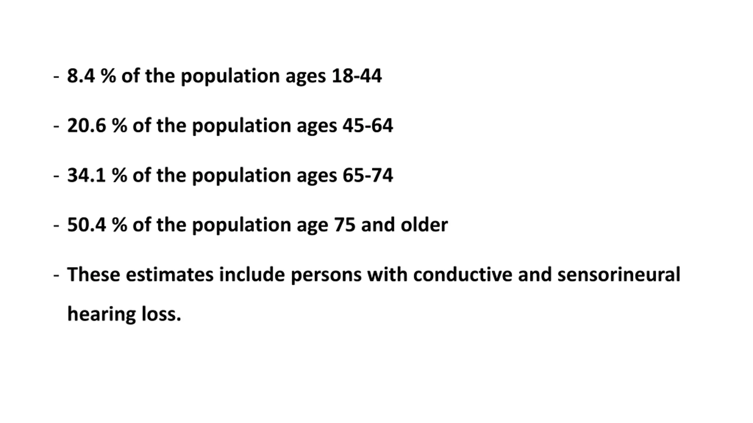- 8.4 % of the population ages 18-44 - 20.6 % of the population ages 45-64 - 34.1 % of the population ages 65-74 - 50.4 % of the population age 75 and older - These estimates include persons with conductive and sensorineural hearing loss.