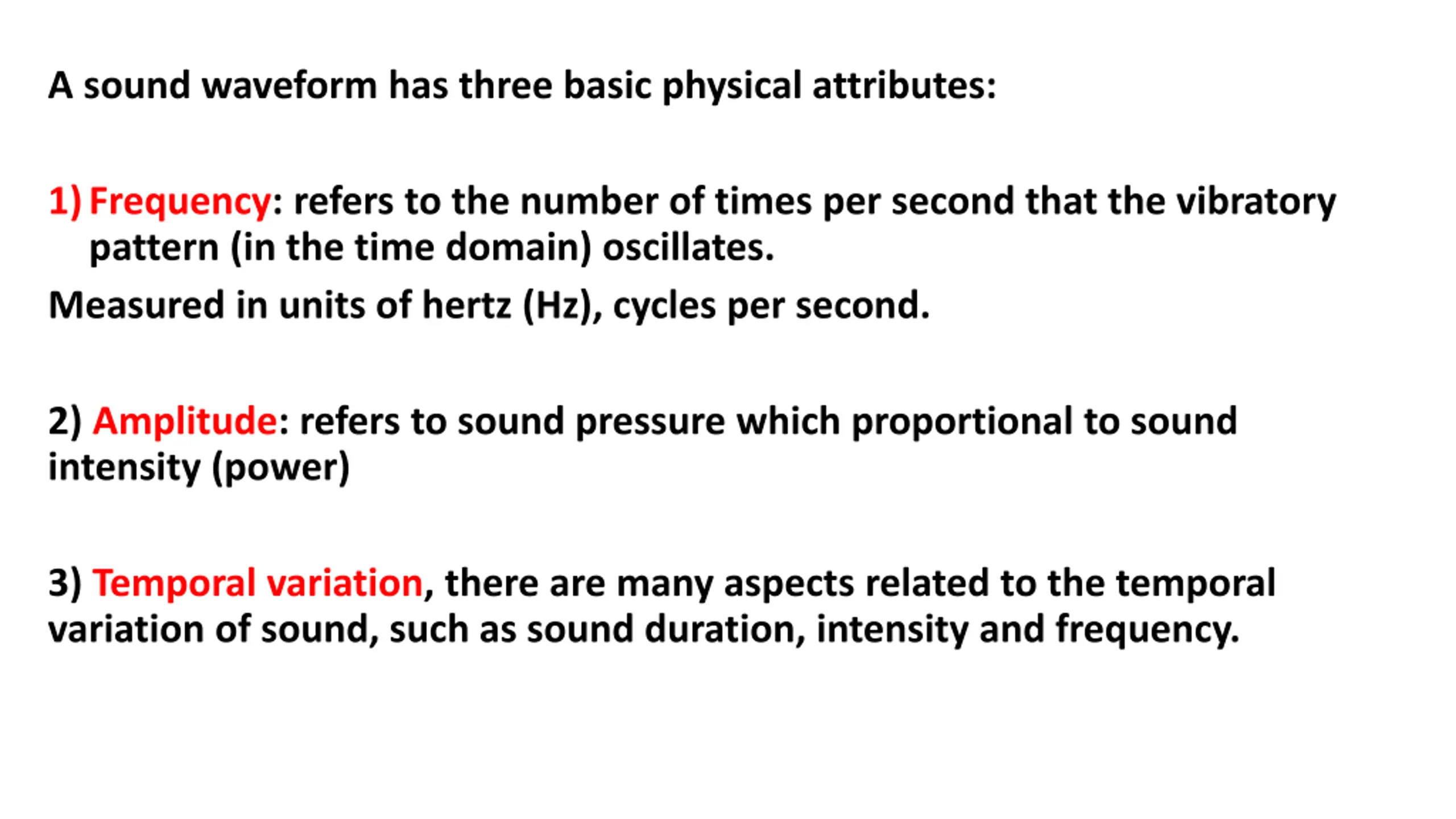 A sound waveform has three basic physical attributes: 1)Frequency: refers to the number of times per second that the vibratory pattern (in the time domain) oscillates. Measured in units of hertz (Hz), cycles per second. 2) Amplitude: refers to sound pressure which proportional to sound intensity (power) 3) Temporal variation, there are many aspects related to the temporal variation of sound, such as sound duration, intensity and frequency.