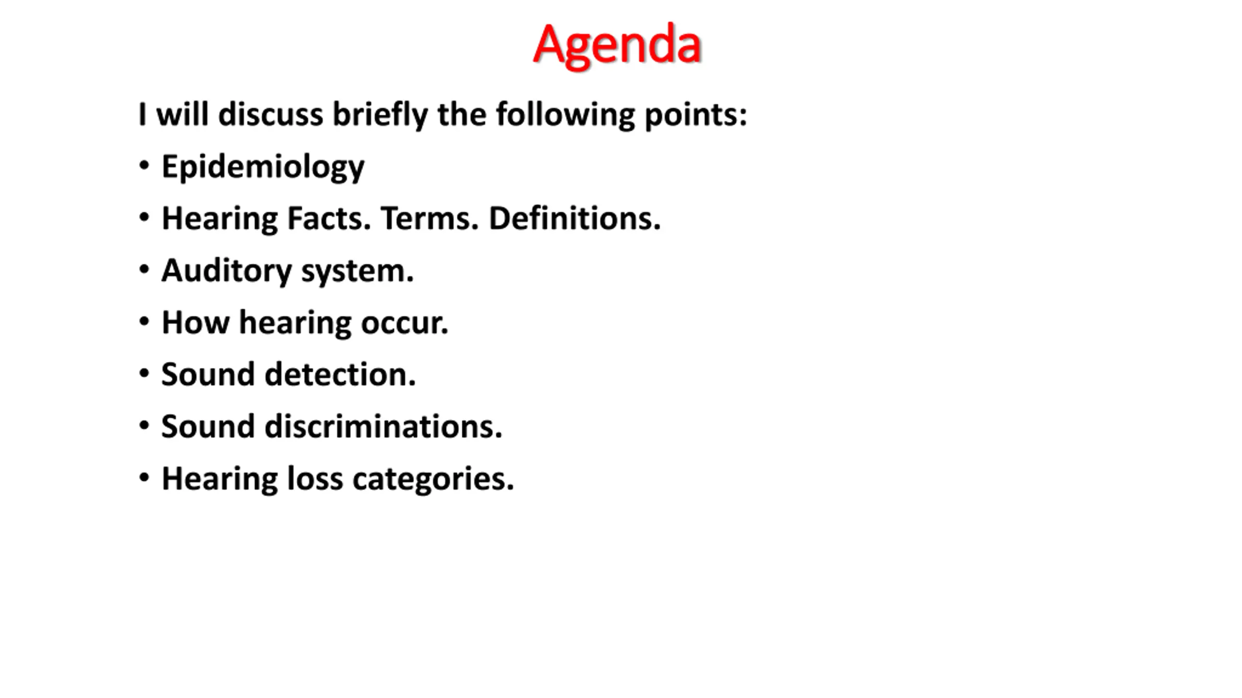 Agenda Agenda I will discuss briefly the following points: Epidemiology Hearing Facts. Terms. Definitions. Auditory system. How hearing occur. Sound detection. Sound discriminations. Hearing loss categories.