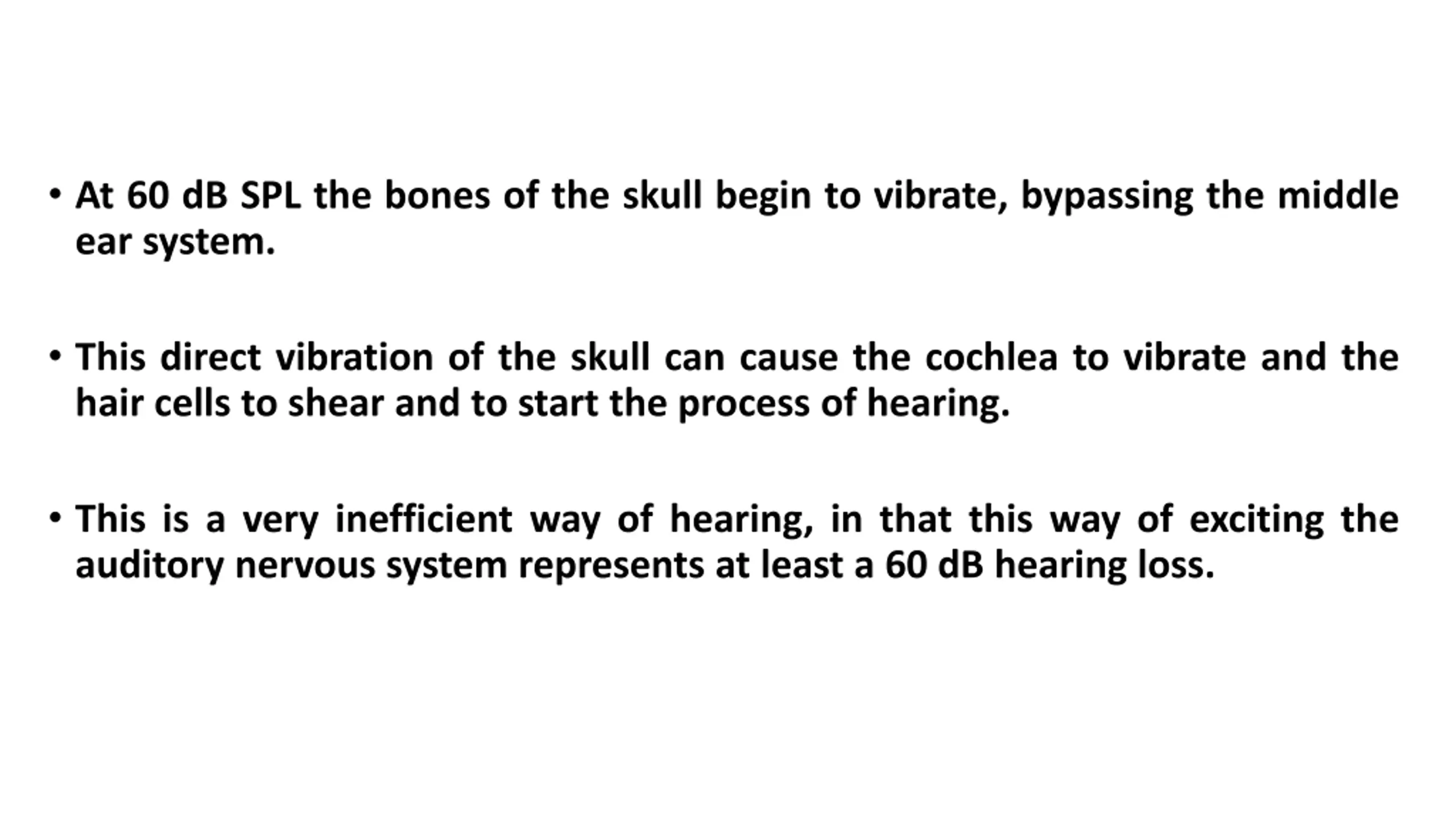 At 60 dB SPL the bones of the skull begin to vibrate, bypassing the middle ear system. This direct vibration of the skull can cause the cochlea to vibrate and the hair cells to shear and to start the process of hearing. This is a very inefficient way of hearing, in that this way of exciting the auditory nervous system represents at least a 60 dB hearing loss.