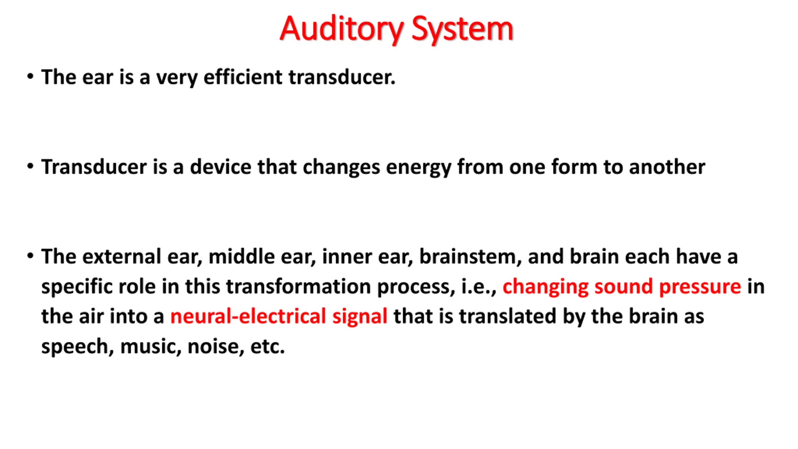 Auditory System Auditory System The ear is a very efficient transducer. Transducer is a device that changes energy from one form to another The external ear, middle ear, inner ear, brainstem, and brain each have a specific role in this transformation process, i.e., changing sound pressure in the air into a neural-electrical signal that is translated by the brain as speech, music, noise, etc.