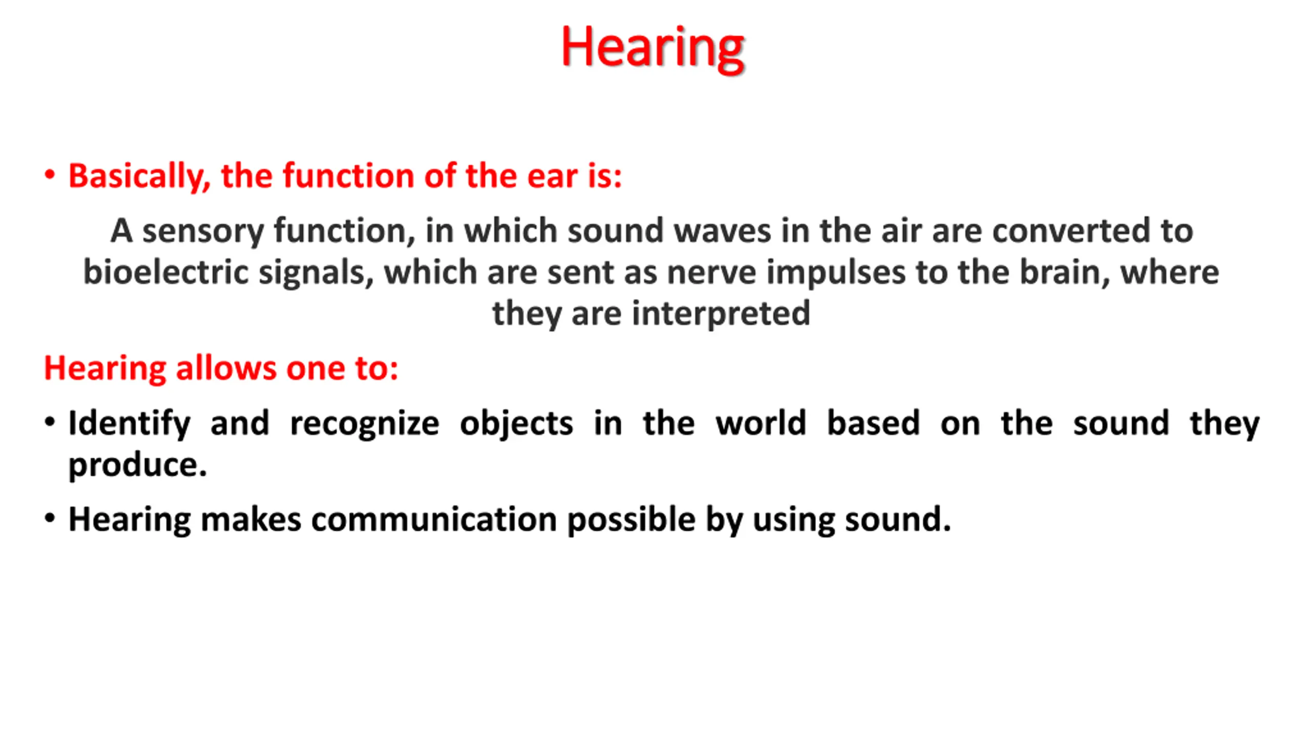 Hearing Hearing Basically, the function of the ear is: A sensory function, in which sound waves in the air are converted to bioelectric signals, which are sent as nerve impulses to the brain, where they are interpreted Hearing allows one to: Identify and recognize objects in the world based on the sound they produce. Hearing makes communication possible by using sound.