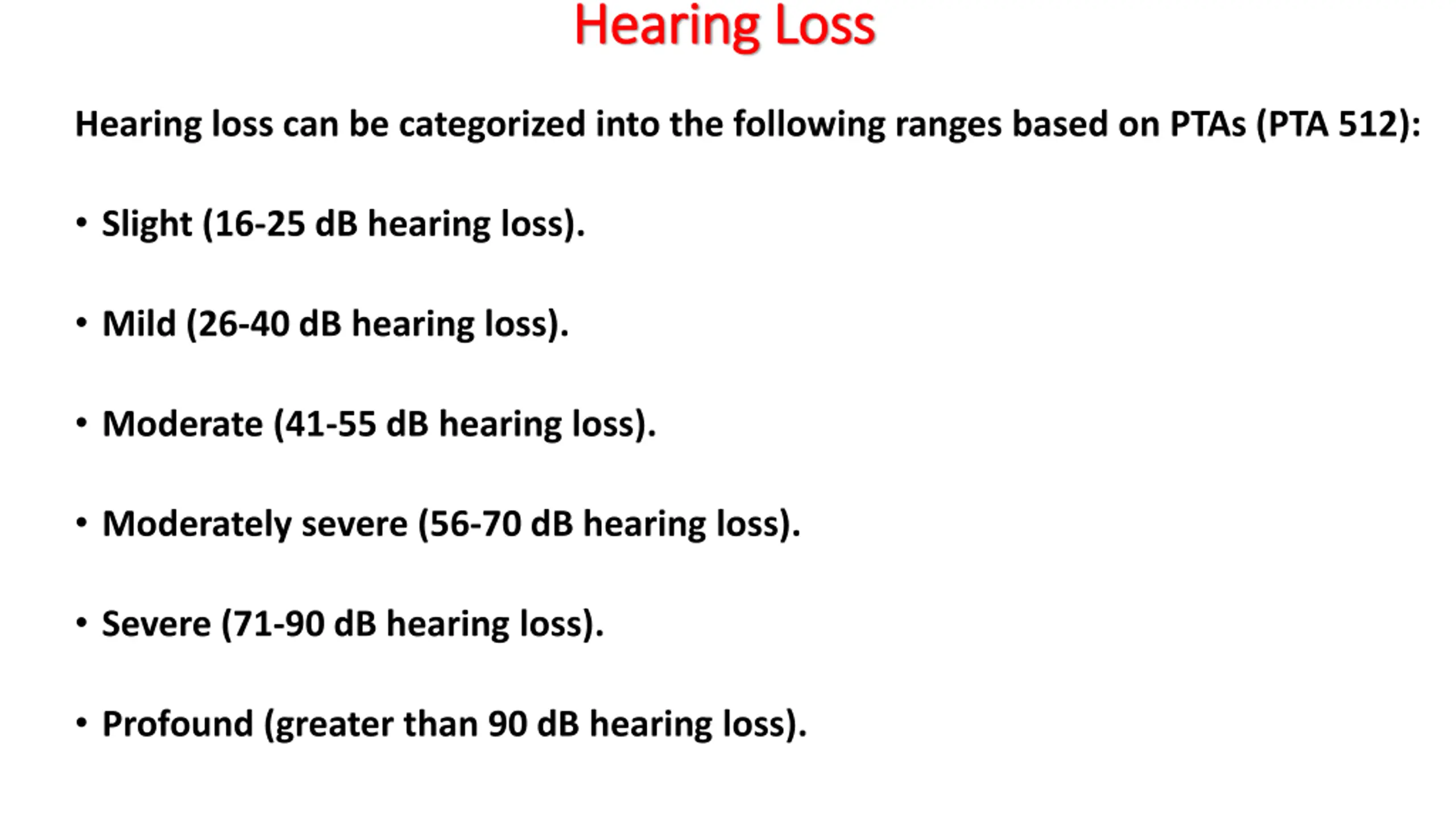 Hearing Loss Hearing Loss Hearing loss can be categorized into the following ranges based on PTAs (PTA 512): Slight (16-25 dB hearing loss). Mild (26-40 dB hearing loss). Moderate (41-55 dB hearing loss). Moderately severe (56-70 dB hearing loss). Severe (71-90 dB hearing loss). Profound (greater than 90 dB hearing loss).