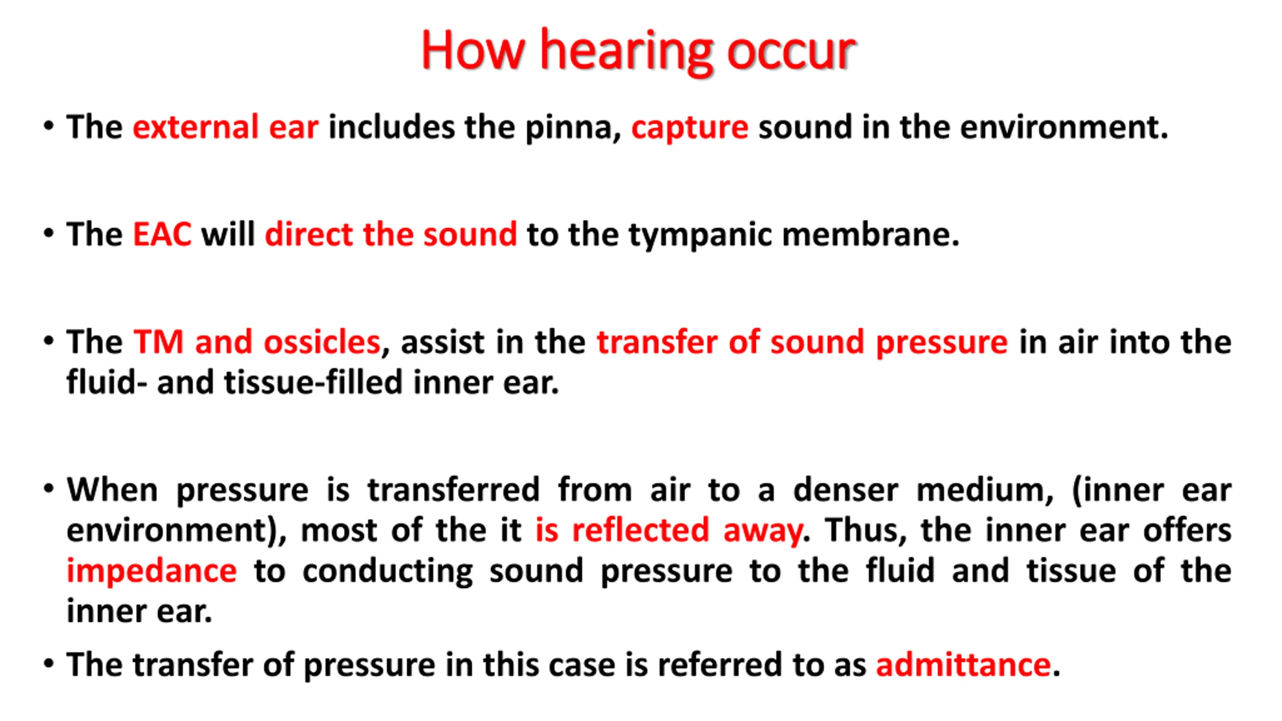 How hearing occur How hearing occur The external ear includes the pinna, capture sound in the environment. The EAC will direct the sound to the tympanic membrane. The TM and ossicles, assist in the transfer of sound pressure in air into the fluid- and tissue-filled inner ear. When pressure is transferred from air to a denser medium, (inner ear environment), most of the it is reflected away. Thus, the inner ear offers impedance to conducting sound pressure to the fluid and tissue of the inner ear. The transfer of pressure in this case is referred to as admittance.