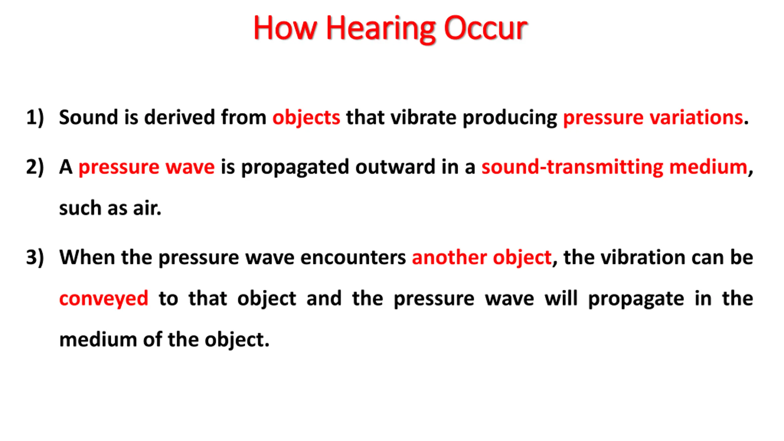 How Hearing Occur How Hearing Occur 1) Sound is derived from objects that vibrate producing pressure variations. 2) A pressure wave is propagated outward in a sound-transmitting medium, such as air. 3) When the pressure wave encounters another object, the vibration can be conveyed to that object and the pressure wave will propagate in the medium of the object.