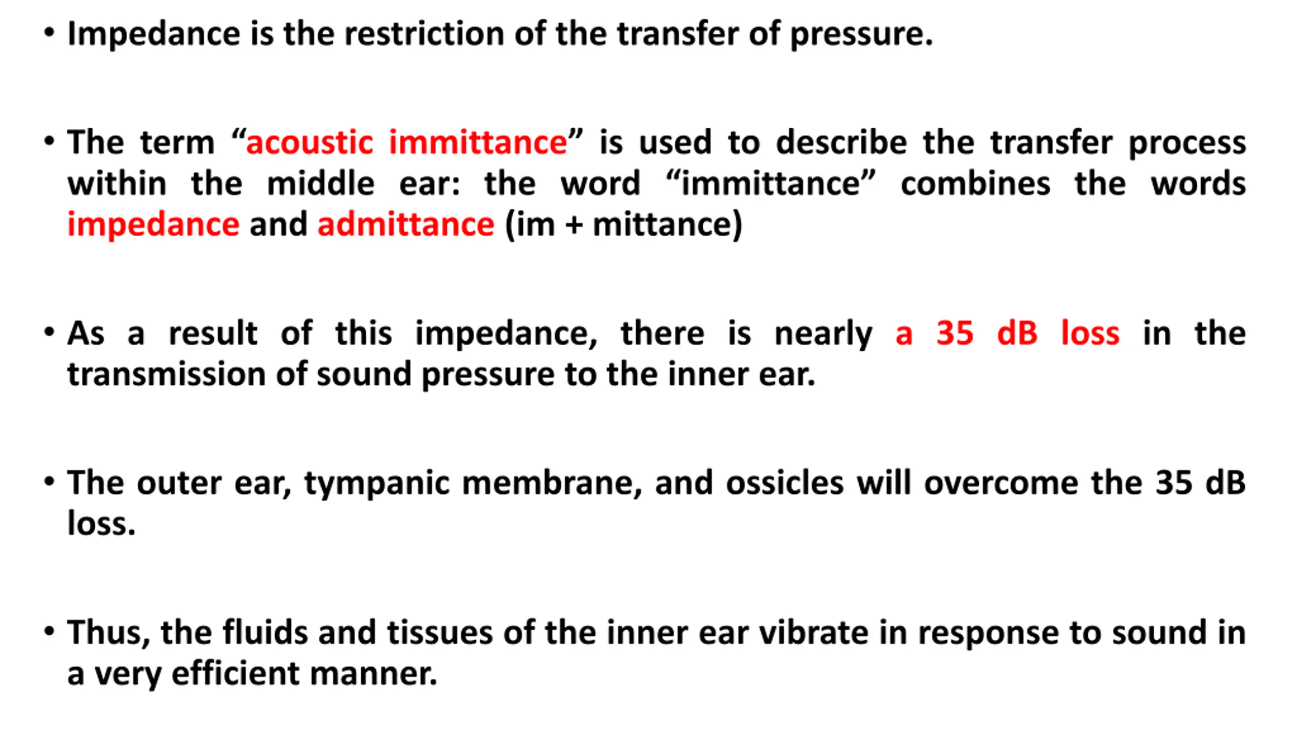 Impedance is the restriction of the transfer of pressure. The term acoustic immittance is used to describe the transfer process within the middle ear: the word immittance combines the words impedance and admittance (im + mittance) As a result of this impedance, there is nearly a 35 dB loss in the transmission of sound pressure to the inner ear. The outer ear, tympanic membrane, and ossicles will overcome the 35 dB loss. Thus, the fluids and tissues of the inner ear vibrate in response to sound in a very efficient manner.