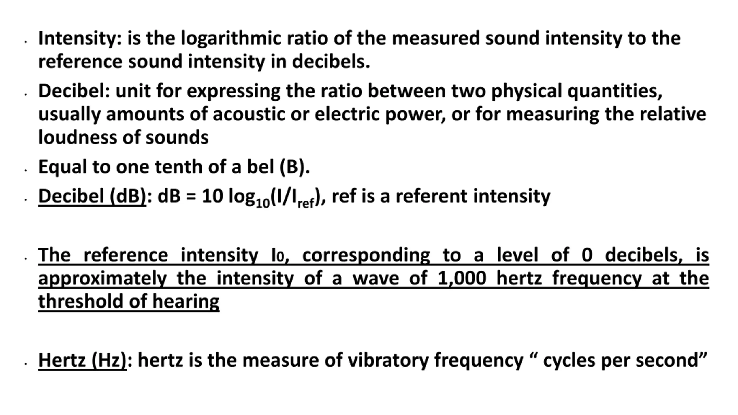 Intensity: is the logarithmic ratio of the measured sound intensity to the reference sound intensity in decibels. Decibel: unit for expressing the ratio between two physical quantities, usually amounts of acoustic or electric power, or for measuring the relative loudness of sounds Equal to one tenth of a bel (B). Decibel (dB): dB = 10 log10(I/Iref), ref is a referent intensity The reference intensity I0, corresponding to a level of 0 decibels, is approximately the intensity of a wave of 1,000 hertz frequency at the threshold of hearing Hertz (Hz): hertz is the measure of vibratory frequency cycles per second