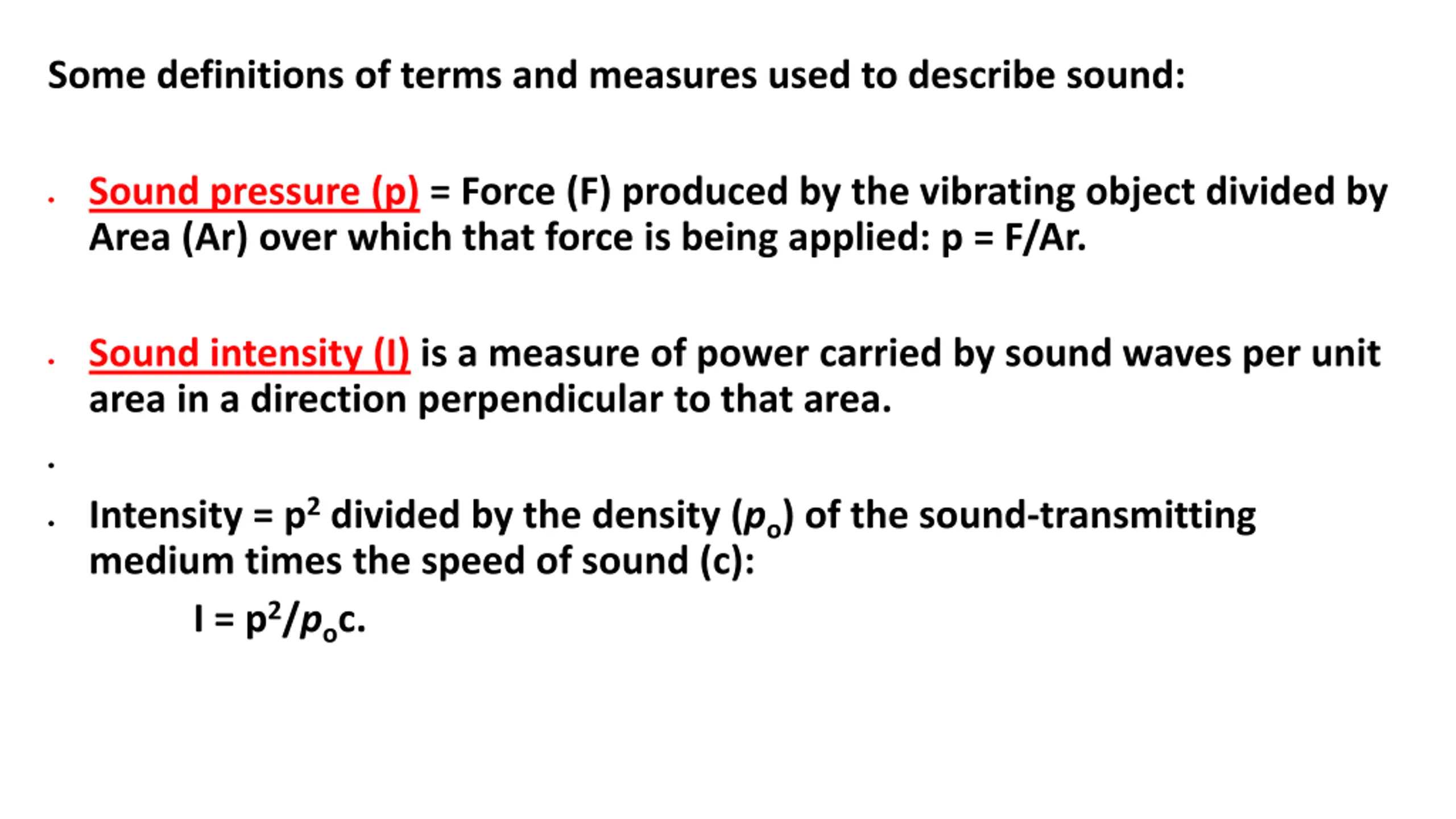 Some definitions of terms and measures used to describe sound: Sound pressure (p) = Force (F) produced by the vibrating object divided by Area (Ar) over which that force is being applied: p = F/Ar. Sound intensity (I) is a measure of power carried by sound waves per unit area in a direction perpendicular to that area. Intensity = p2divided by the density (po) of the sound-transmitting medium times the speed of sound (c): I = p2/poc.