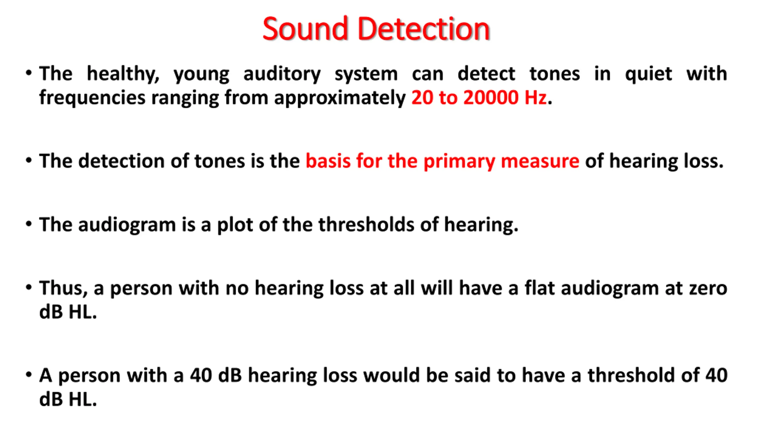 Sound Detection Sound Detection The healthy, young auditory system can detect tones in quiet with frequencies ranging from approximately 20 to 20000 Hz. The detection of tones is the basis for the primary measure of hearing loss. The audiogram is a plot of the thresholds of hearing. Thus, a person with no hearing loss at all will have a flat audiogram at zero dB HL. A person with a 40 dB hearing loss would be said to have a threshold of 40 dB HL.
