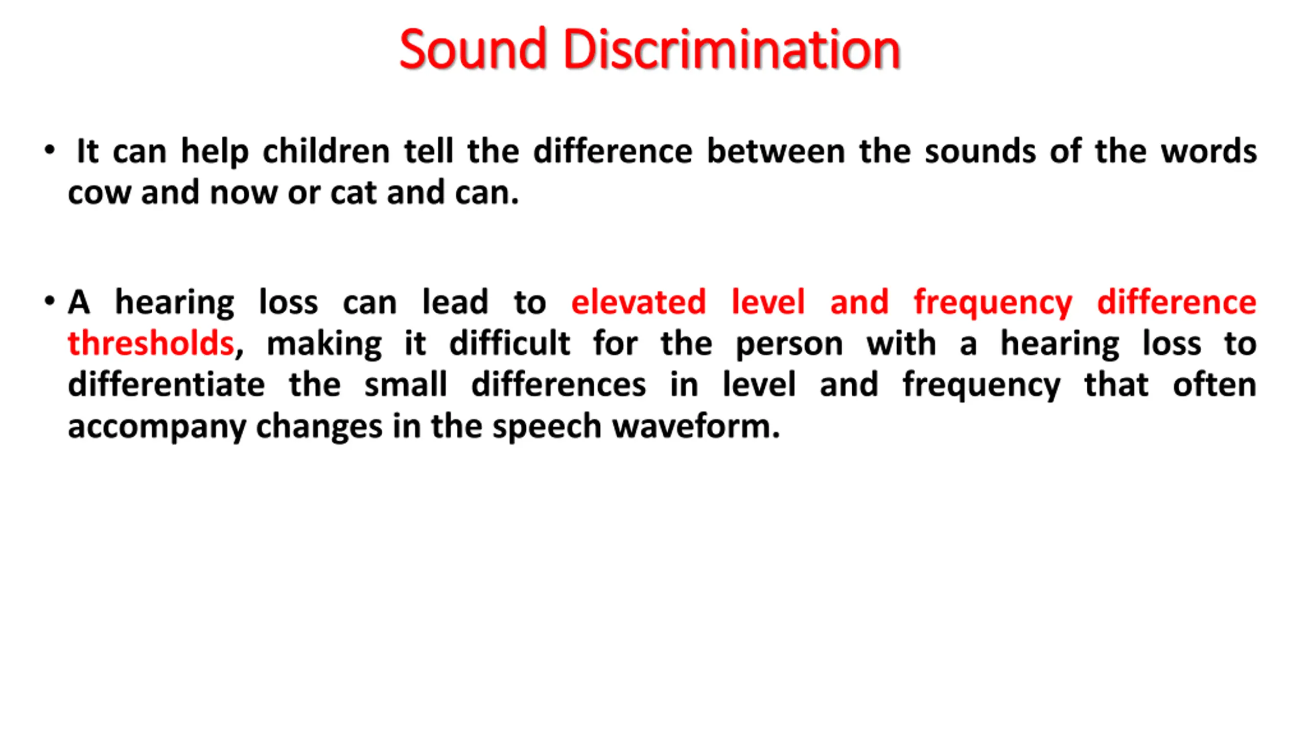 Sound Discrimination Sound Discrimination It can help children tell the difference between the sounds of the words cow and now or cat and can. A hearing loss can lead to elevated level and frequency difference thresholds, making it difficult for the person with a hearing loss to differentiate the small differences in level and frequency that often accompany changes in the speech waveform.
