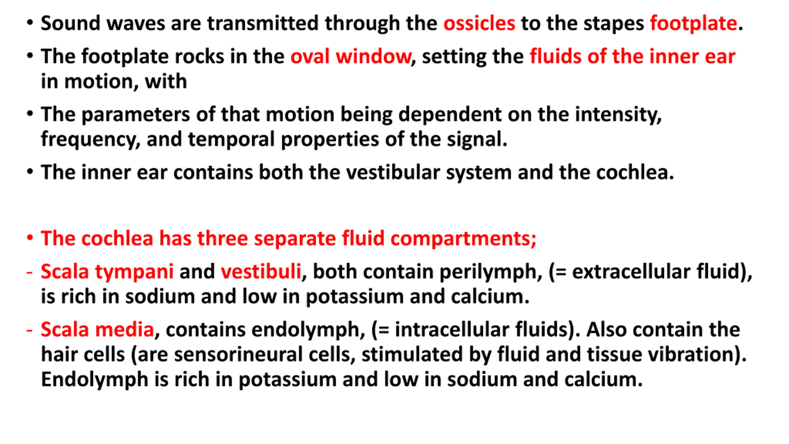 Sound waves are transmitted through the ossicles to the stapes footplate. The footplate rocks in the oval window, setting the fluids of the inner ear in motion, with The parameters of that motion being dependent on the intensity, frequency, and temporal properties of the signal. The inner ear contains both the vestibular system and the cochlea. The cochlea has three separate fluid compartments; - Scala tympani and vestibuli, both contain perilymph, (= extracellular fluid), is rich in sodium and low in potassium and calcium. - Scala media, contains endolymph, (= intracellular fluids). Also contain the hair cells (are sensorineural cells, stimulated by fluid and tissue vibration). Endolymph is rich in potassium and low in sodium and calcium.