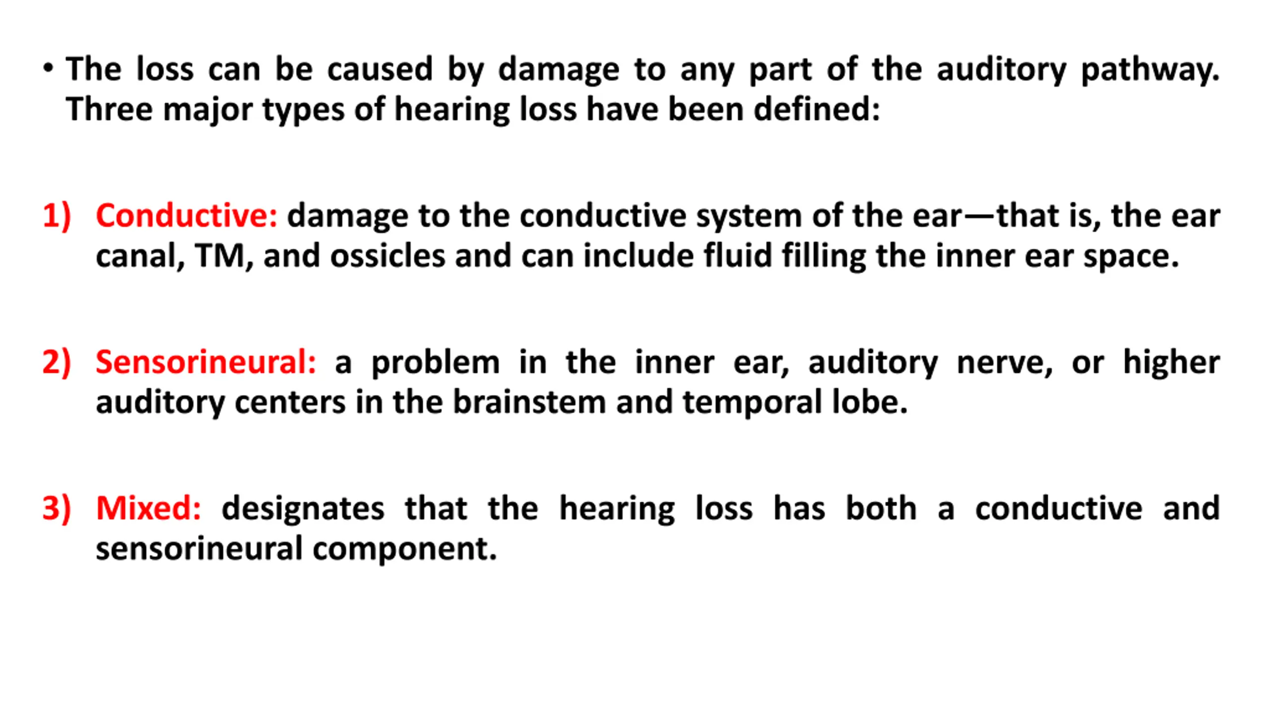 The loss can be caused by damage to any part of the auditory pathway. Three major types of hearing loss have been defined: 1) Conductive: damage to the conductive system of the ear that is, the ear canal, TM, and ossicles and can include fluid filling the inner ear space. 2) Sensorineural: a problem in the inner ear, auditory nerve, or higher auditory centers in the brainstem and temporal lobe. 3) Mixed: designates that the hearing loss has both a conductive and sensorineural component.