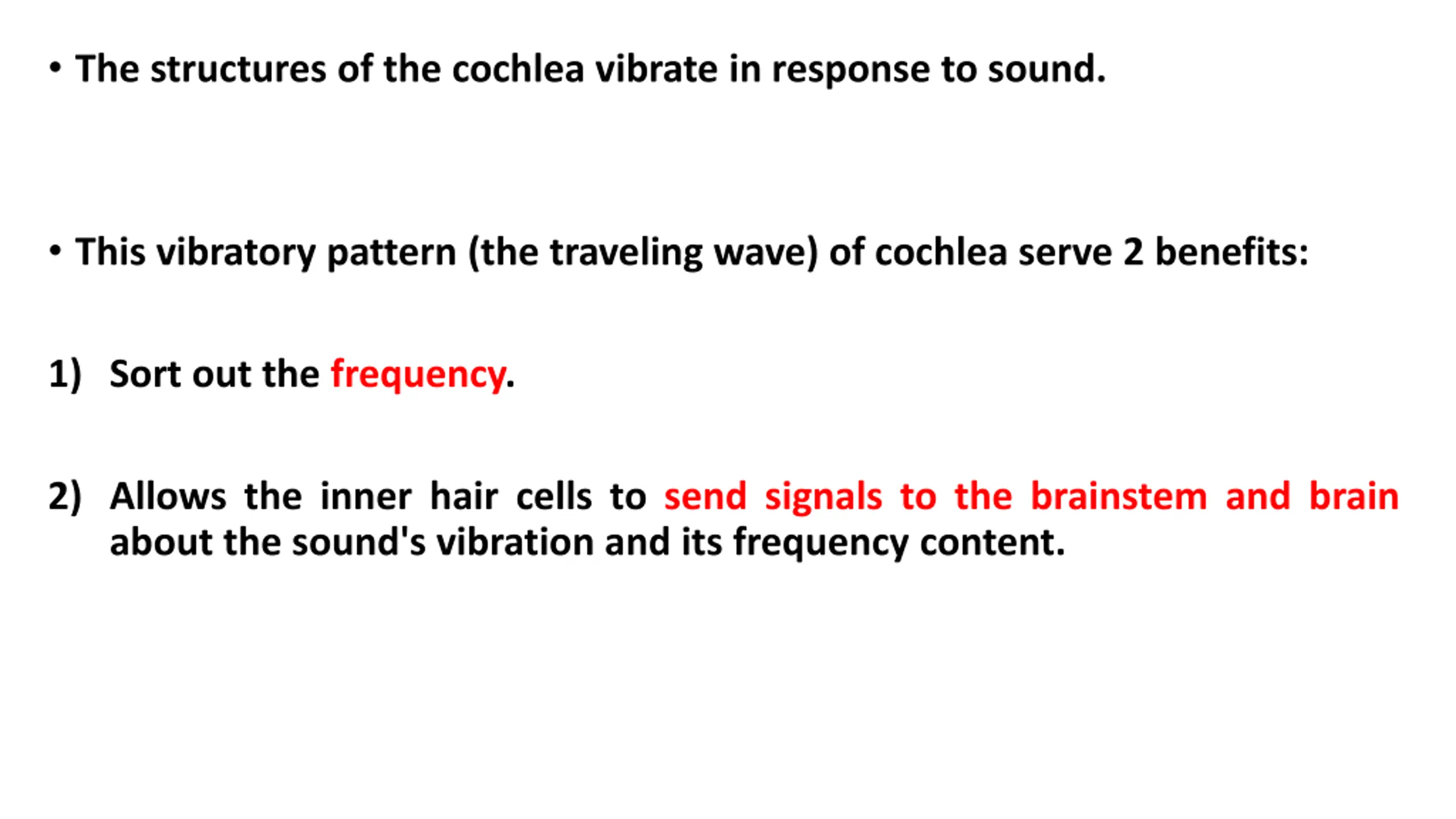 The structures of the cochlea vibrate in response to sound. This vibratory pattern (the traveling wave) of cochlea serve 2 benefits: 1) Sort out the frequency. 2) Allows the inner hair cells to send signals to the brainstem and brain about the sound's vibration and its frequency content.