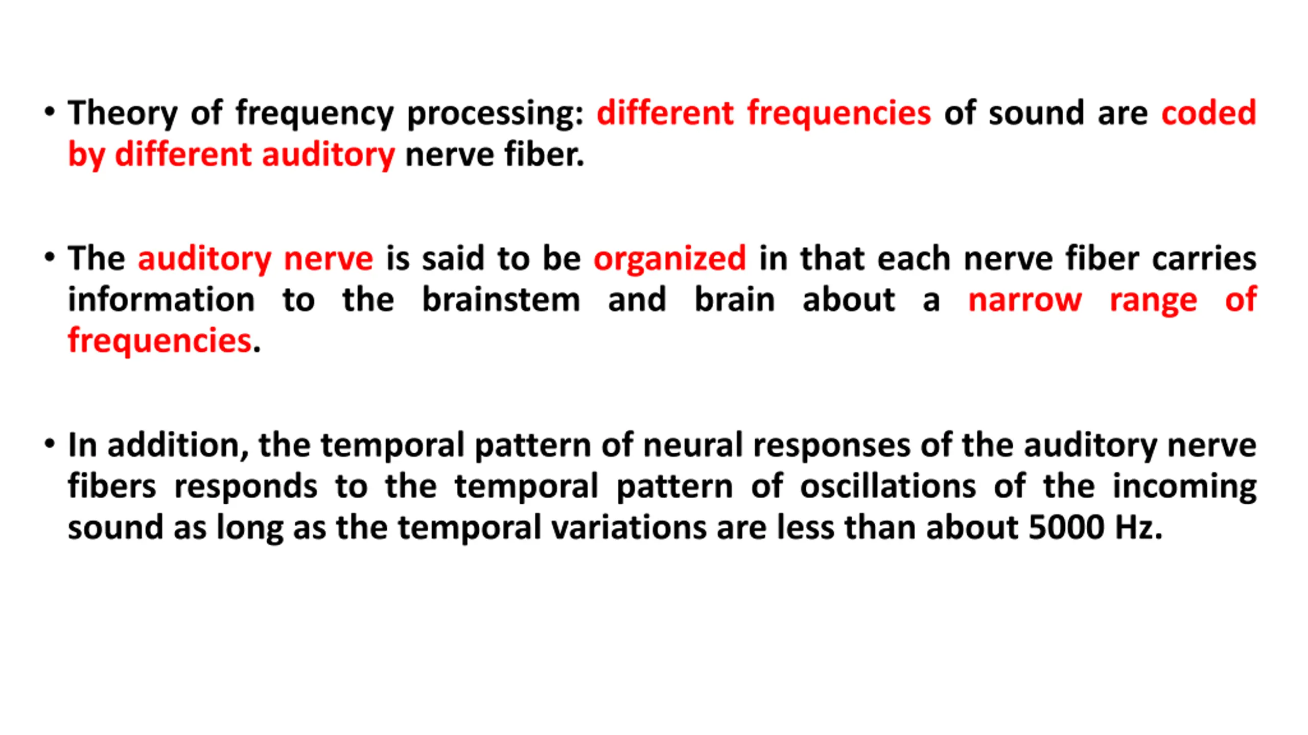 Theory of frequency processing: different frequencies of sound are coded by different auditory nerve fiber. The auditory nerve is said to be organized in that each nerve fiber carries information to the brainstem and brain about a narrow range of frequencies. In addition, the temporal pattern of neural responses of the auditory nerve fibers responds to the temporal pattern of oscillations of the incoming sound as long as the temporal variations are less than about 5000 Hz.