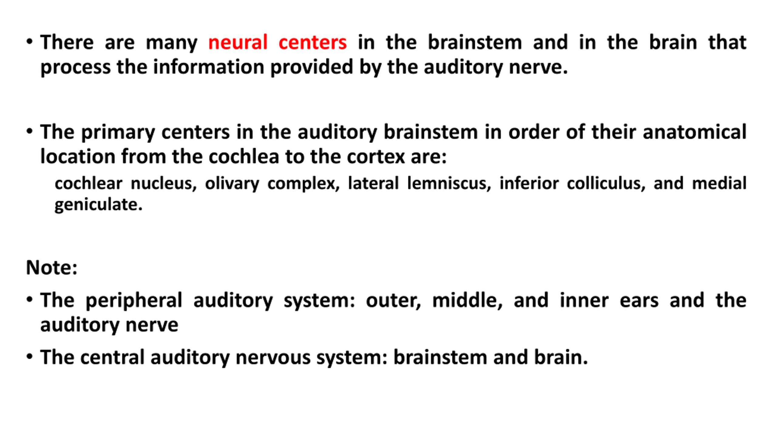 There are many neural centers in the brainstem and in the brain that process the information provided by the auditory nerve. The primary centers in the auditory brainstem in order of their anatomical location from the cochlea to the cortex are: cochlear nucleus, olivary complex, lateral lemniscus, inferior colliculus, and medial geniculate. Note: The peripheral auditory system: outer, middle, and inner ears and the auditory nerve The central auditory nervous system: brainstem and brain.