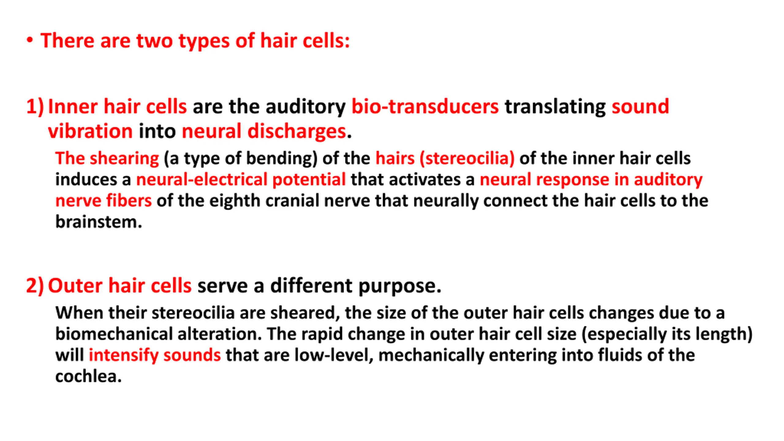 There are two types of hair cells: 1)Inner hair cells are the auditory bio-transducers translating sound vibration into neural discharges. The shearing (a type of bending) of the hairs (stereocilia) of the inner hair cells induces a neural-electrical potential that activates a neural response in auditory nerve fibers of the eighth cranial nerve that neurally connect the hair cells to the brainstem. 2)Outer hair cells serve a different purpose. When their stereocilia are sheared, the size of the outer hair cells changes due to a biomechanical alteration. The rapid change in outer hair cell size (especially its length) will intensify sounds that are low-level, mechanically entering into fluids of the cochlea.