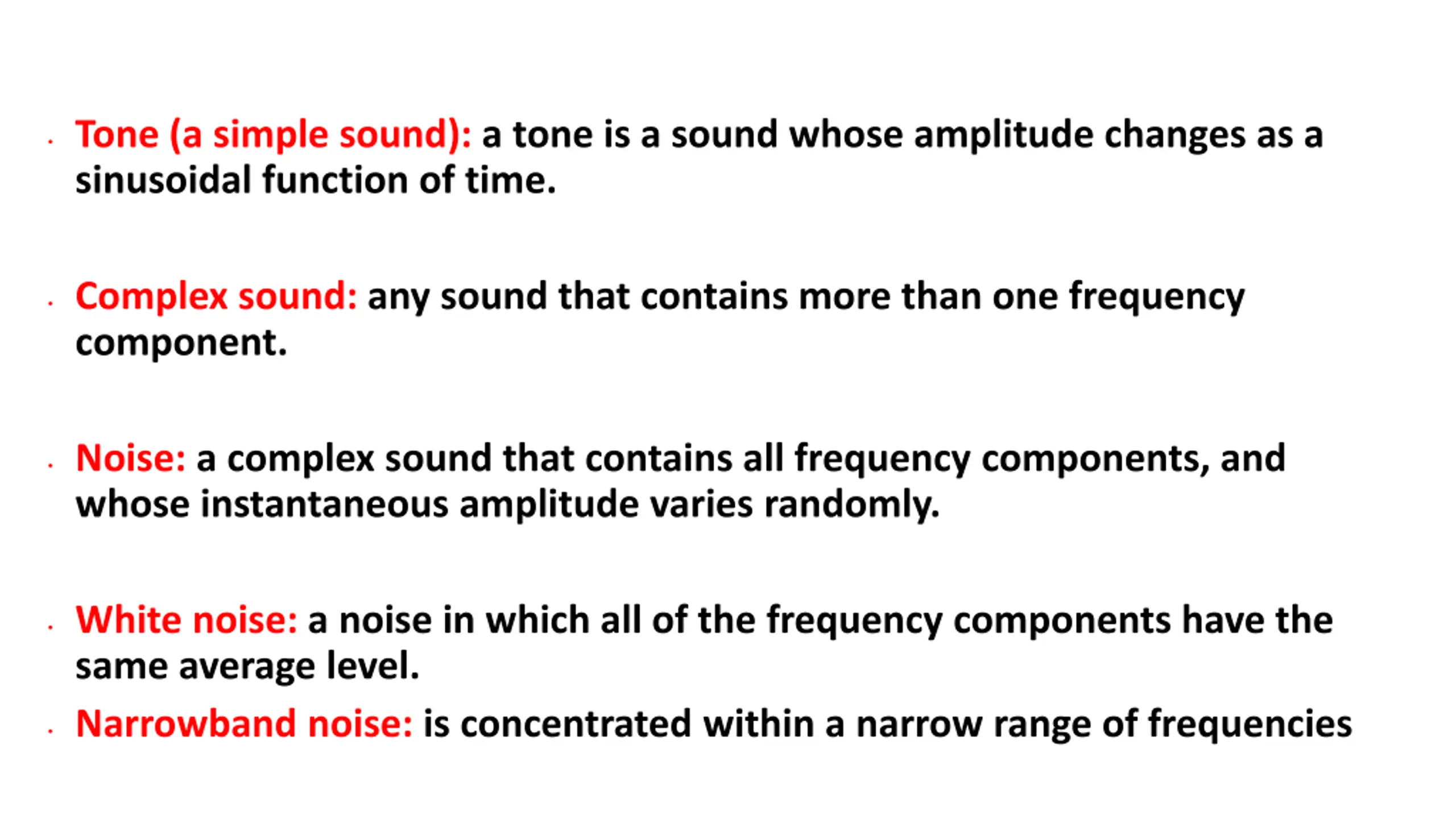 Tone (a simple sound): a tone is a sound whose amplitude changes as a sinusoidal function of time. Complex sound: any sound that contains more than one frequency component. Noise: a complex sound that contains all frequency components, and whose instantaneous amplitude varies randomly. White noise: a noise in which all of the frequency components have the same average level. Narrowband noise: is concentrated within a narrow range of frequencies