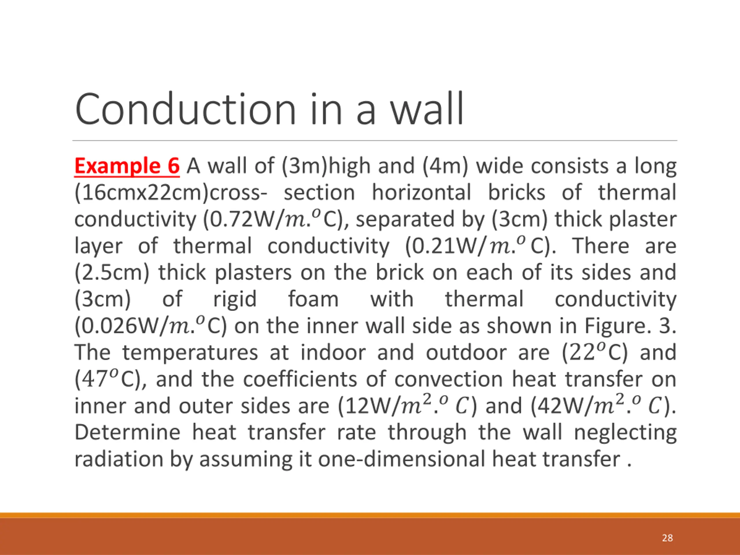 Conduction in a wall Example 6 A wall of (3m)high and (4m) wide consists a long (16cmx22cm)cross- section horizontal bricks of thermal conductivity (0.72W/?.?C), separated by (3cm) thick plaster layer of thermal conductivity (0.21W/?.?C). There are (2.5cm) thick plasters on the brick on each of its sides and (3cm) of rigid foam with (0.026W/?.?C) on the inner wall side as shown in Figure. 3. The temperatures at indoor and outdoor are (22?C) and (47?C), and the coefficients of convection heat transfer on inner and outer sides are (12W/?2.??) and (42W/?2.??). Determine heat transfer rate through the wall neglecting radiation by assuming it one-dimensional heat transfer . thermal conductivity 28