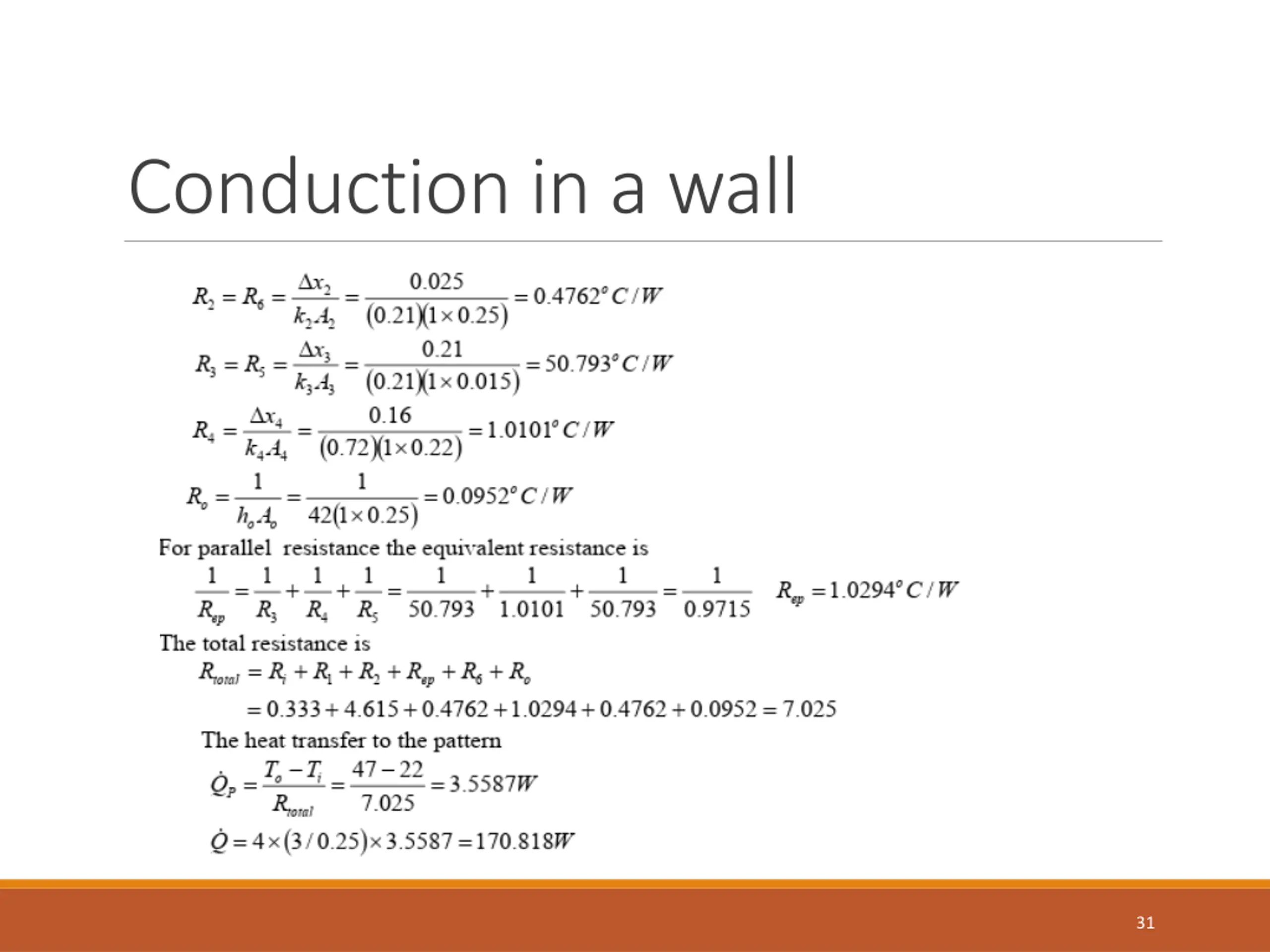 Conduction in a wall Solution: a wall of brick of cross-section area of (16cmx22cm)with a layer of plaster on each side and rigid foam layer on the inner side the wall is exposed to convection heat transfer on the two sides. From Figure. we can determine the thermal resistance for each component in this composite wall. Property: constant thermal conductivity Assumption: steady state one- dimensional heat transfer, and no effect of radiation Analysis: firstly we calculate the resistance of a pattern as shown in the Figure. 29