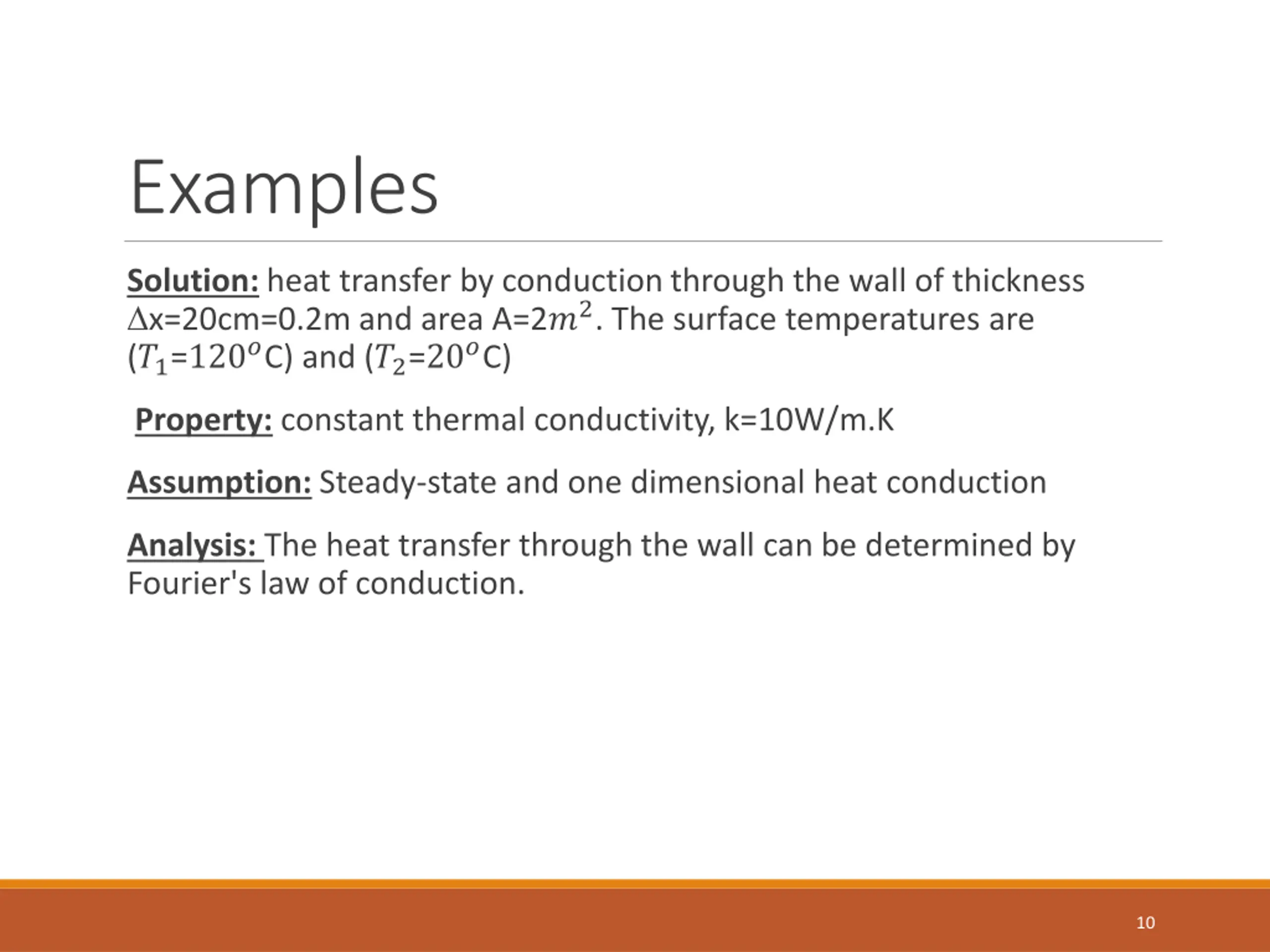 Examples Solution: heat transfer by conduction through the wall of thickness x=20cm=0.2m and area A=2?2. The surface temperatures are (?1=120?C) and (?2=20?C) Property: constant thermal conductivity, k=10W/m.K Assumption: Steady-state and one dimensional heat conduction Analysis: The heat transfer through the wall can be determined by Fourier's law of conduction. 10