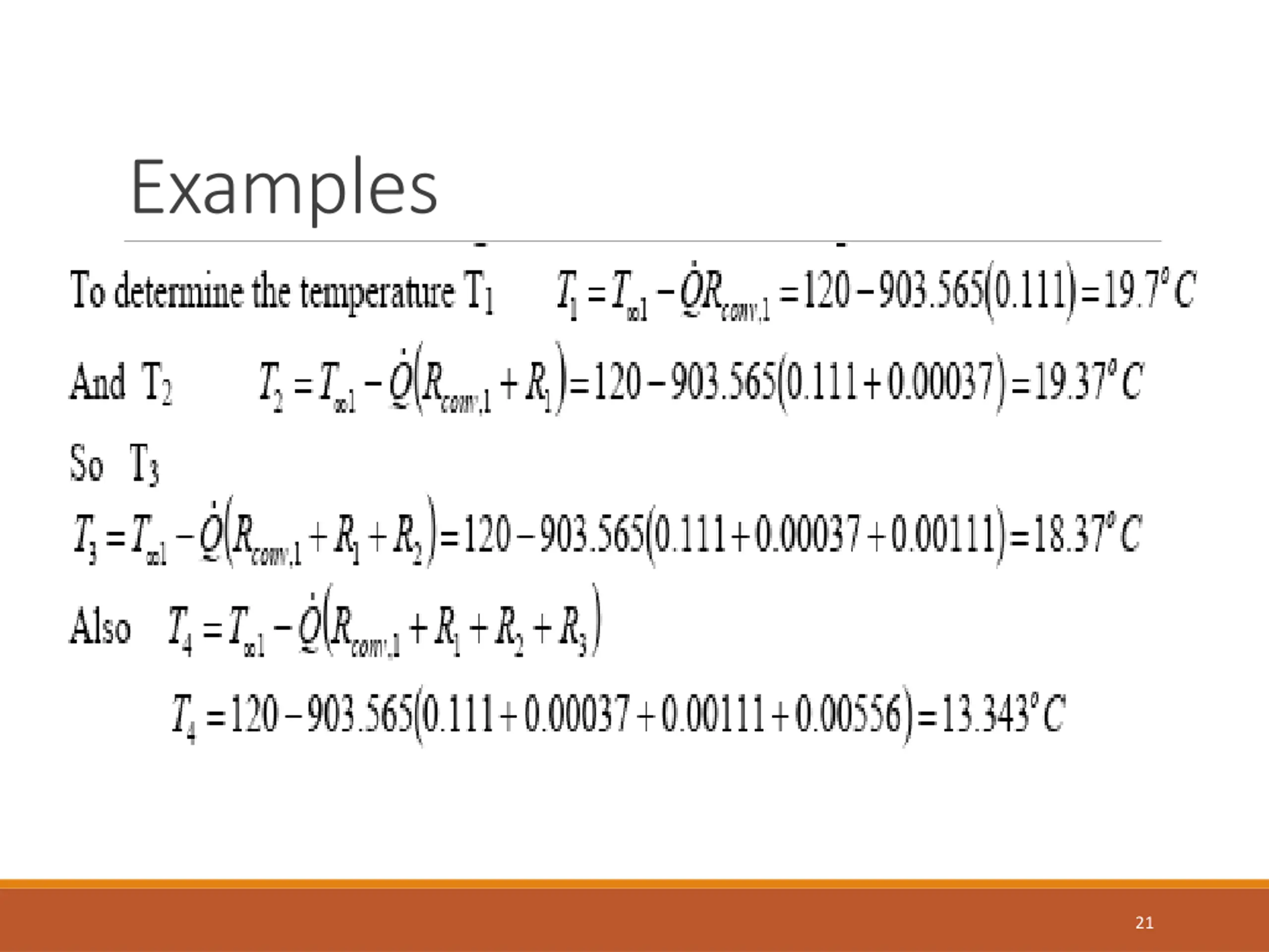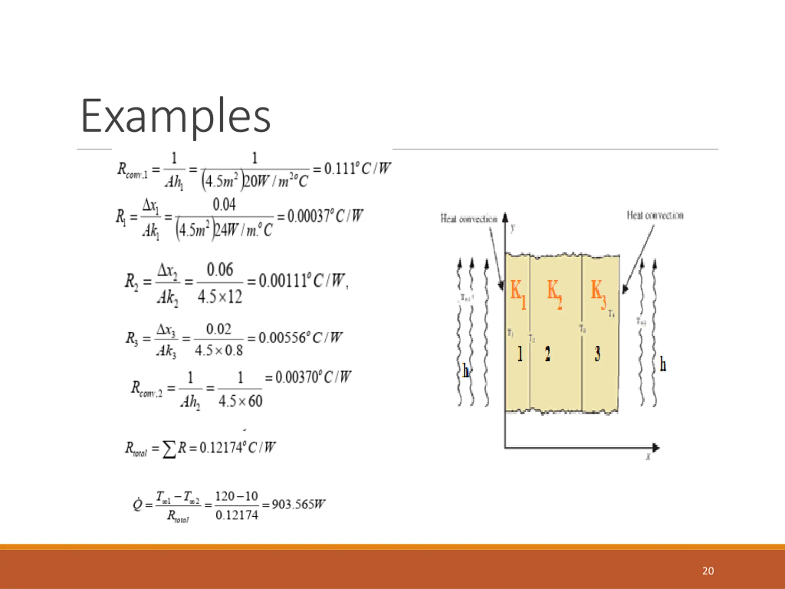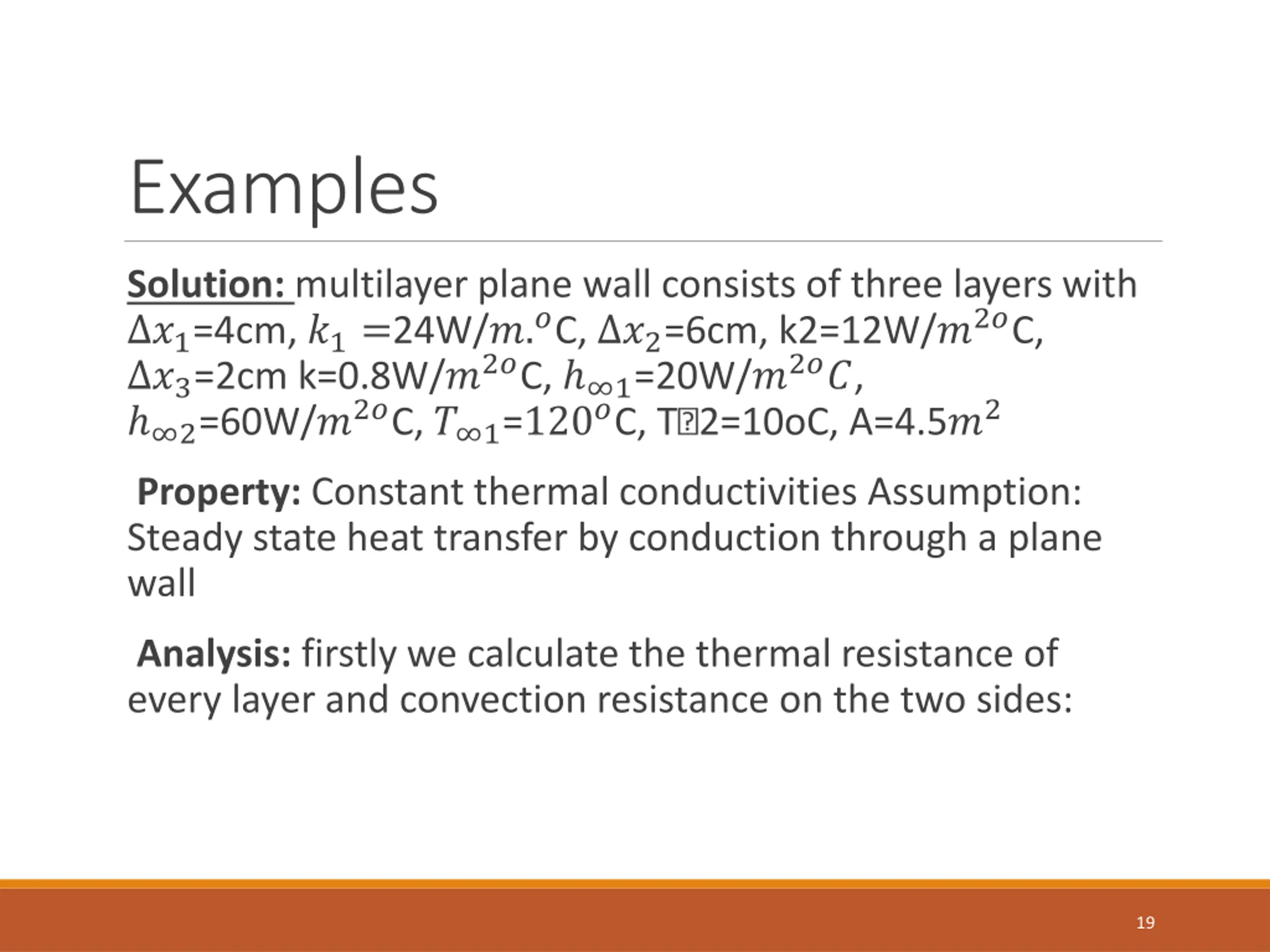 Examples Solution: multilayer plane wall consists of three layers with ?1=4cm, ?1=24W/?.?C, ?2=6cm, k2=12W/?2?C, ?3=2cm k=0.8W/?2?C, 1=20W/?2??, 2=60W/?2?C, ? 1=120?C, T 2=10oC, A=4.5?2 Property: Constant thermal conductivities Assumption: Steady state heat transfer by conduction through a plane wall Analysis: firstly we calculate the thermal resistance of every layer and convection resistance on the two sides: 19