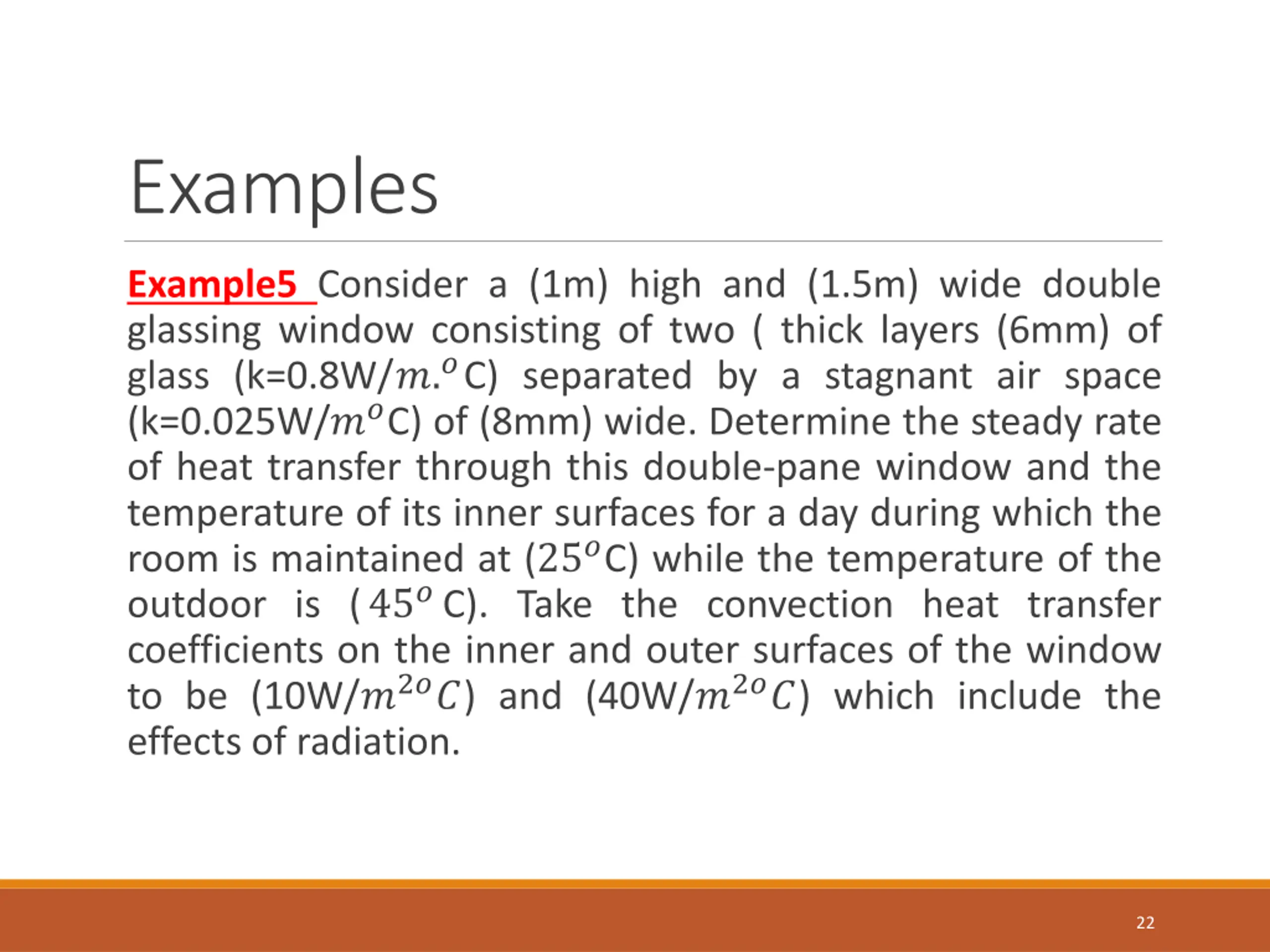 Examples Example5 Consider a (1m) high and (1.5m) wide double glassing window consisting of two ( thick layers (6mm) of glass (k=0.8W/?.?C) separated by a stagnant air space (k=0.025W/??C) of (8mm) wide. Determine the steady rate of heat transfer through this double-pane window and the temperature of its inner surfaces for a day during which the room is maintained at (25?C) while the temperature of the outdoor is (45?C). Take the convection heat transfer coefficients on the inner and outer surfaces of the window to be (10W/?2??) and (40W/?2??) which include the effects of radiation. 22