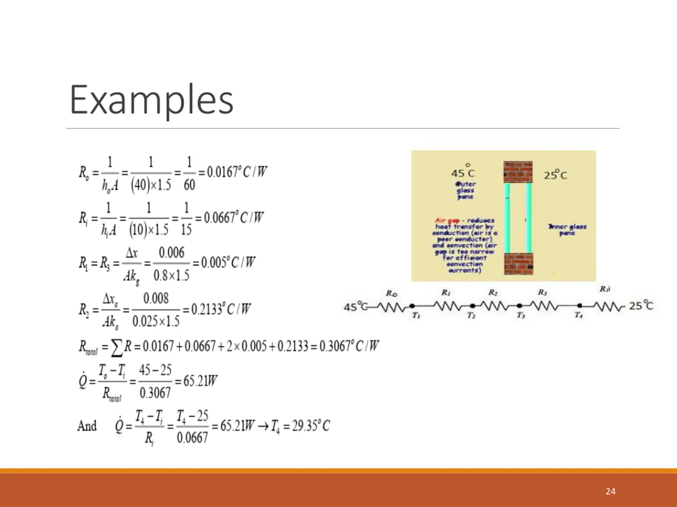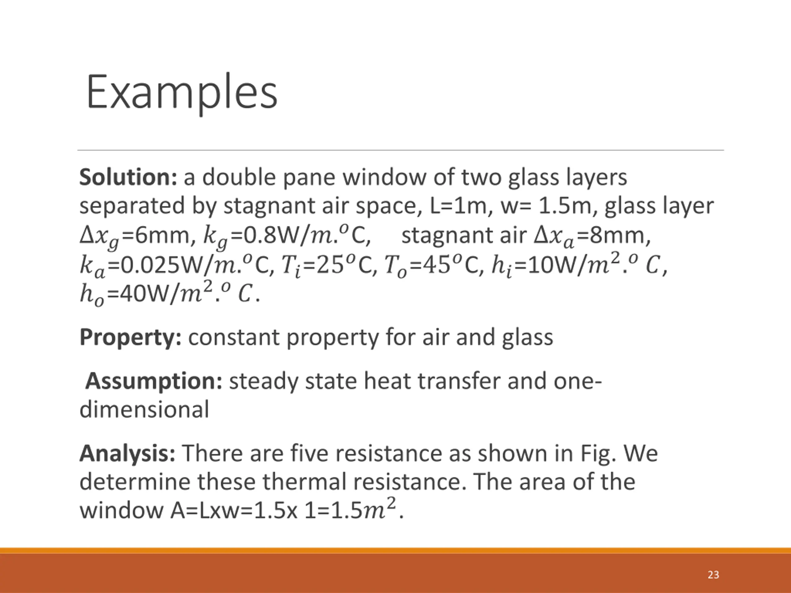 Examples Solution: a double pane window of two glass layers separated by stagnant air space, L=1m, w= 1.5m, glass layer ??=6mm, ??=0.8W/?.?C, stagnant air ??=8mm, ??=0.025W/?.?C, ??=25?C, ??=45?C, ?=10W/?2.??, ?=40W/?2.??. Property: constant property for air and glass Assumption: steady state heat transfer and one- dimensional Analysis: There are five resistance as shown in Fig. We determine these thermal resistance. The area of the window A=Lxw=1.5x 1=1.5?2. 23